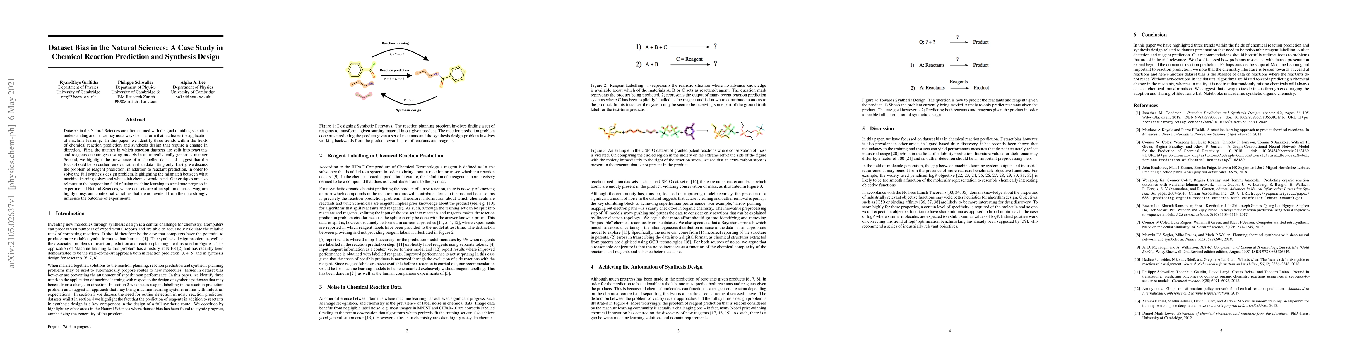 This paper critiques biases in chemical reaction datasets used for machine learning, identifying three main issues: unrealistic model testing due to dataset splitting, prevalence of mislabelled data, and the neglect of reagent prediction in favor of reactant prediction for complete synthesis design. The findings underscore the need for improved dataset curation and methodology to better support machine learning applications in natural sciences.