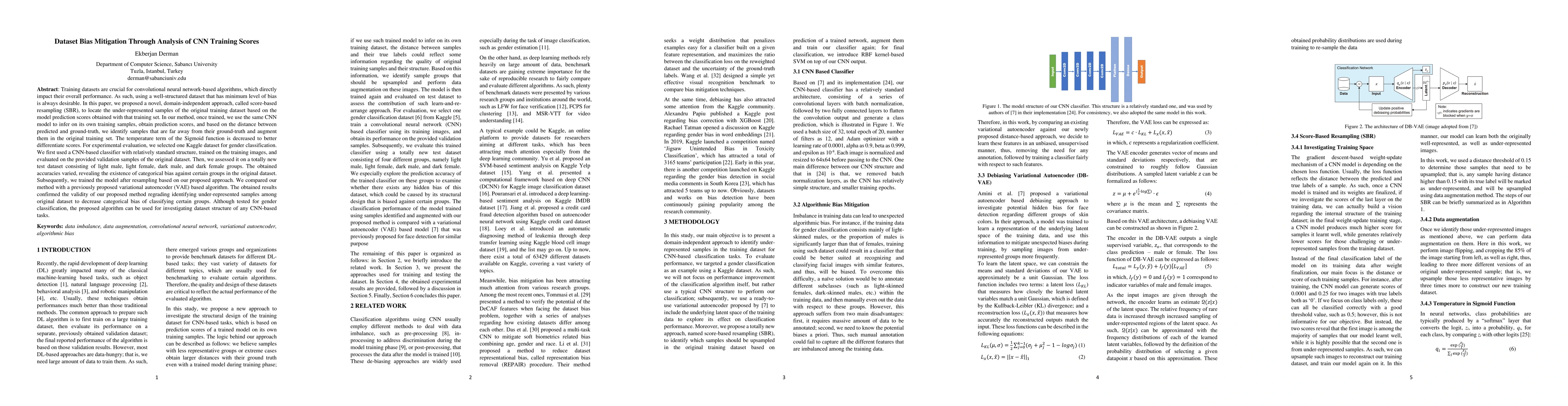 Training datasets are crucial for convolutional neural network-based algorithms, which directly impact their overall performance. As such, using a well-structured dataset that has minimum level of bias is always desirable. In this paper, we proposed a novel, domain-independent approach, called score-based resampling (SBR), to locate the under-represented samples of the original training dataset based on the model prediction scores obtained with that training set. In our method, once trained, we use the same CNN model to infer on its own training samples, obtain prediction scores, and based on the distance between predicted and ground-truth, we identify samples that are far away from their ground-truth and augment them in the original training set. The temperature term of the Sigmoid function is decreased to better differentiate scores. For experimental evaluation, we selected one Kaggle dataset for gender classification. We first used a CNN-based classifier with relatively standard structure, trained on the training images, and evaluated on the provided validation samples of the original dataset. Then, we assessed it on a totally new test dataset consisting of light male, light female, dark male, and dark female groups. The obtained accuracies varied, revealing the existence of categorical bias against certain groups in the original dataset. Subsequently, we trained the model after resampling based on our proposed approach. We compared our method with a previously proposed variational autoencoder (VAE) based algorithm. The obtained results confirmed the validity of our proposed method regrading identifying under-represented samples among original dataset to decrease categorical bias of classifying certain groups. Although tested for gender classification, the proposed algorithm can be used for investigating dataset structure of any CNN-based tasks.