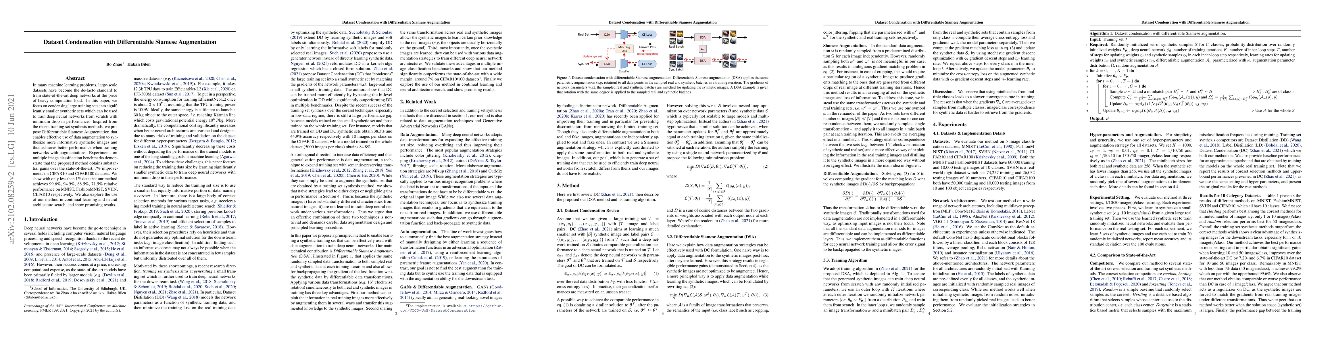 In many machine learning problems, large-scale datasets have become the de-facto standard to train state-of-the-art deep networks at the price of heavy computation load. In this paper, we focus on condensing large training sets into significantly smaller synthetic sets which can be used to train deep neural networks from scratch with minimum drop in performance. Inspired from the recent training set synthesis methods, we propose Differentiable Siamese Augmentation that enables effective use of data augmentation to synthesize more informative synthetic images and thus achieves better performance when training networks with augmentations. Experiments on multiple image classification benchmarks demonstrate that the proposed method obtains substantial gains over the state-of-the-art, 7% improvements on CIFAR10 and CIFAR100 datasets. We show with only less than 1% data that our method achieves 99.6%, 94.9%, 88.5%, 71.5% relative performance on MNIST, FashionMNIST, SVHN, CIFAR10 respectively. We also explore the use of our method in continual learning and neural architecture search, and show promising results.
