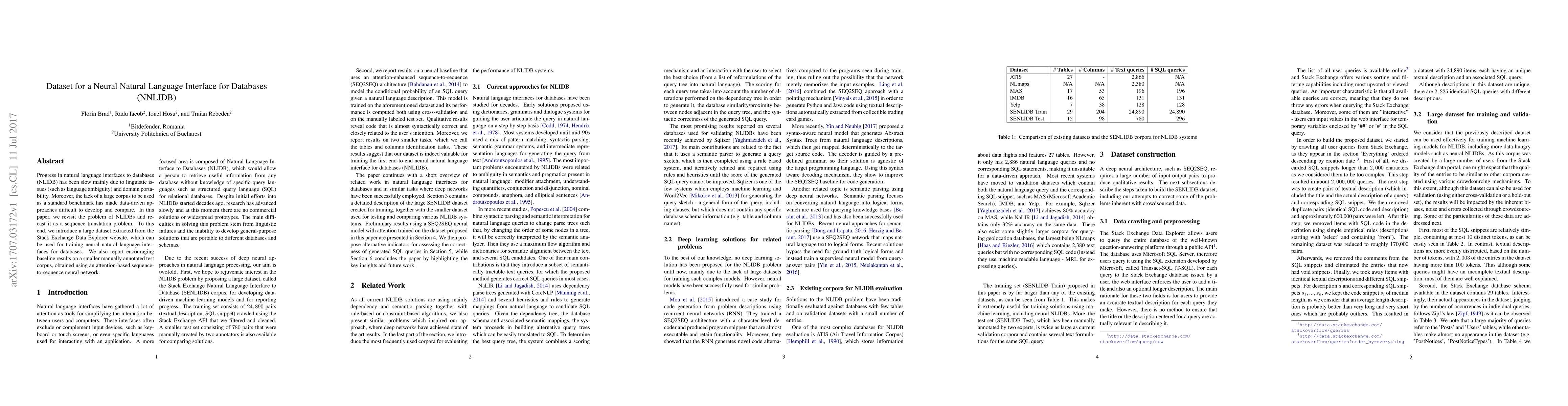 This paper introduces a large dataset from Stack Exchange Data Explorer for training neural natural language interfaces for databases, addressing linguistic ambiguities and portability issues. Preliminary results using an attention-based sequence-to-sequence model on a smaller annotated test set are promising.