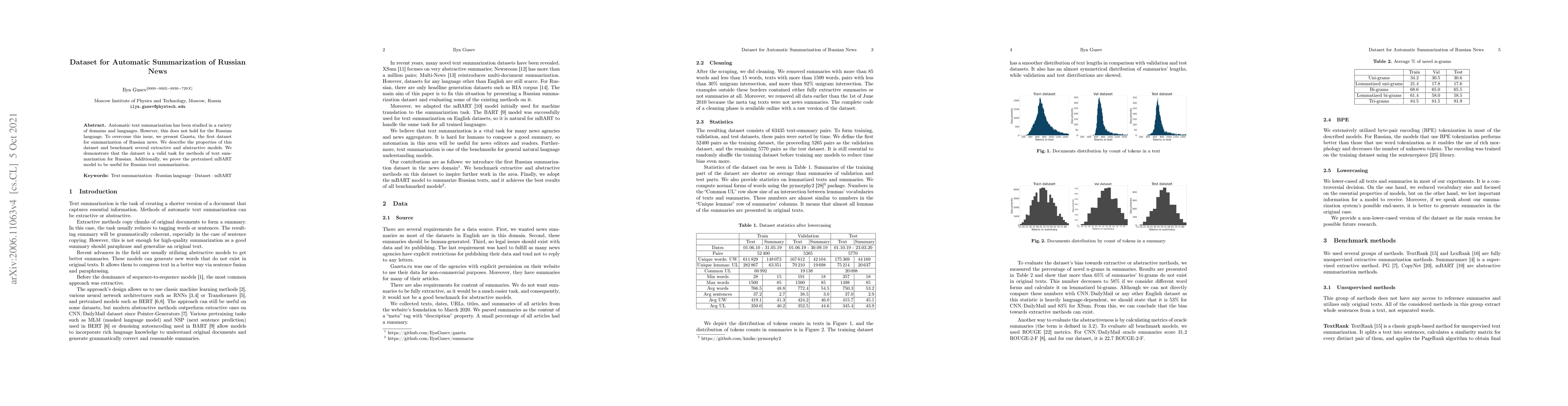 This paper introduces Gazeta, the first dataset for automatic summarization of Russian news, and benchmarks several models, showing its effectiveness for Russian text summarization and the utility of the pretrained mBART model for this task.