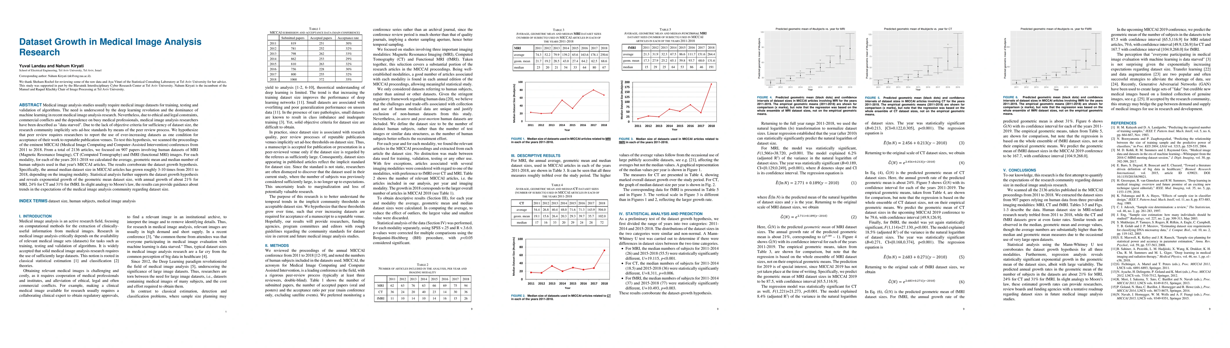 Medical image analysis research datasets have grown significantly since 2011, with average sizes increasing 3-10 times for MRI, CT, and fMRI between 2011 and 2018. The growth is exponential, suggesting the medical community's increasing expectations for dataset size.