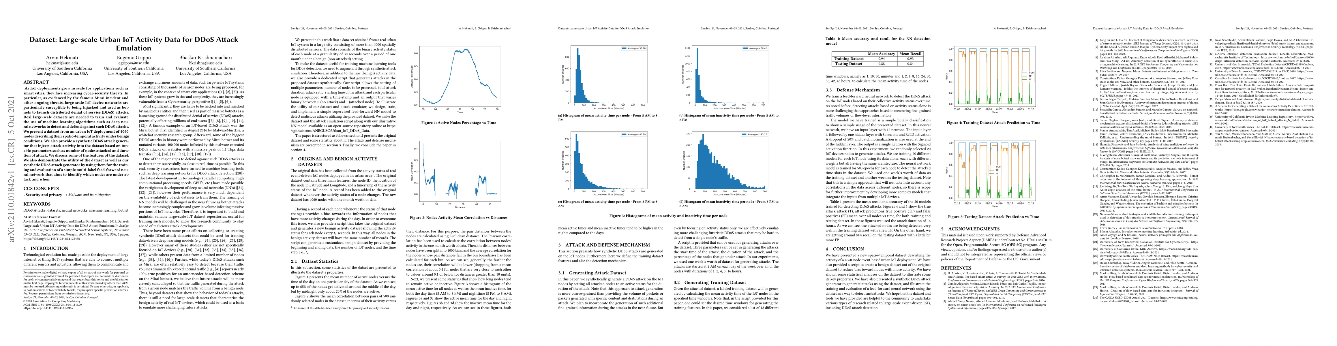 This paper presents a large-scale urban IoT dataset comprising 4060 nodes' spatio-temporal activity, along with a synthetic DDoS attack generator to simulate attacks. The dataset is used to train and evaluate a neural network for detecting DDoS attacks based on node activity.