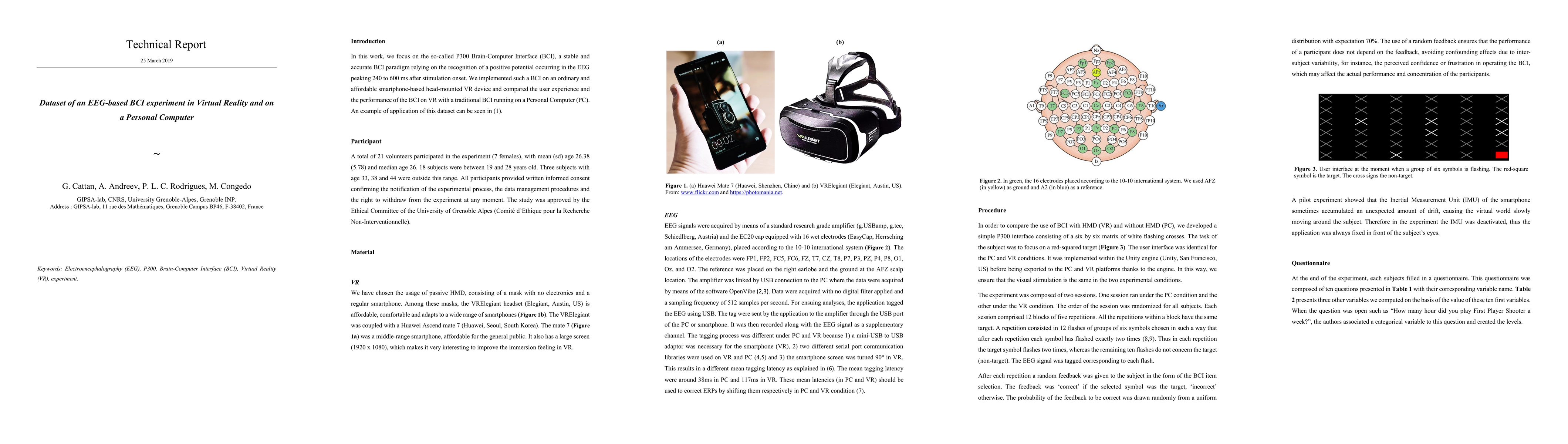 This paper presents a publicly available EEG dataset from a P300-based BCI experiment comparing PC and VR environments, recorded on 21 subjects using 16 electrodes. The dataset aims to analyze physiological, subjective, and performance aspects of BCI in both settings.