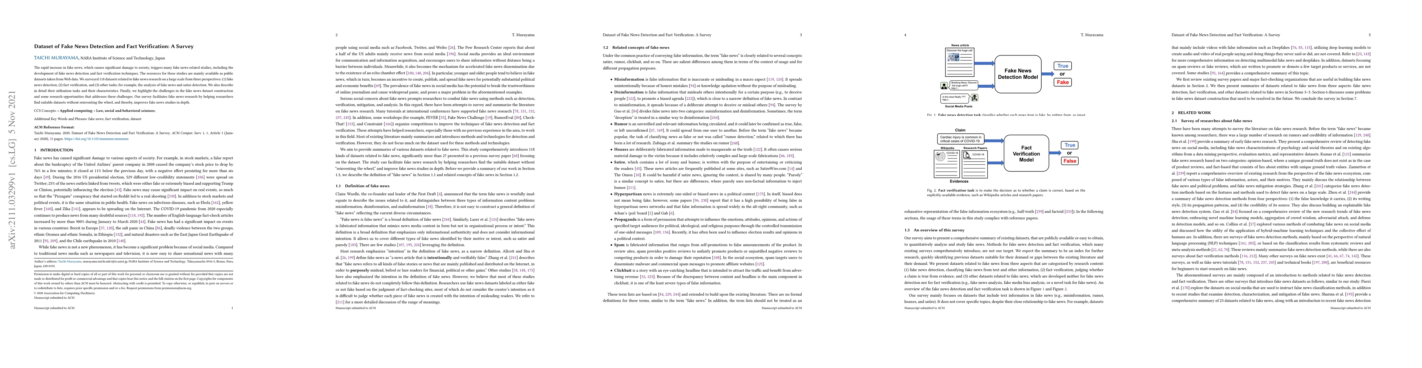 This survey reviews 118 datasets for fake news detection and fact verification, categorizing them into fake news detection, fact verification, and other tasks. It highlights challenges in dataset construction and offers research opportunities to improve the field.