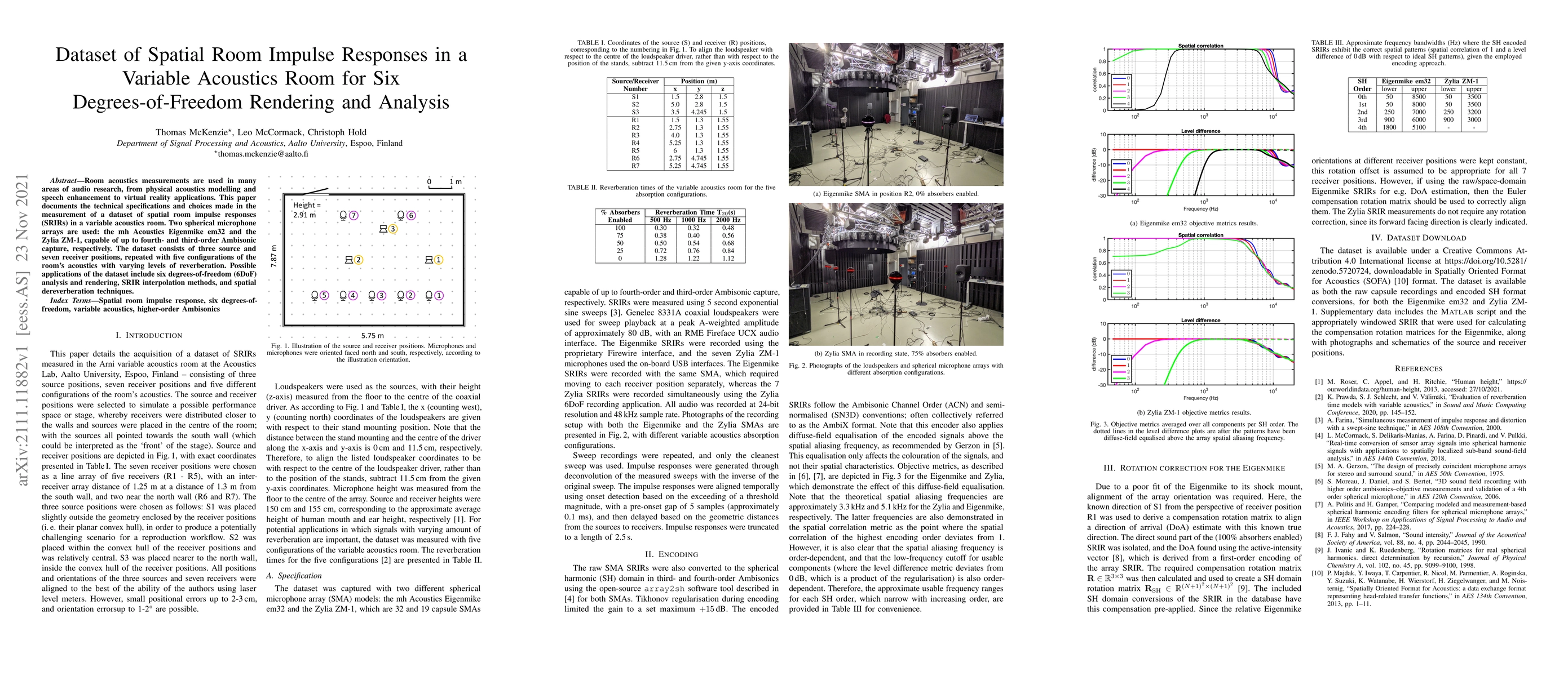 Room acoustics measurements are used in many areas of audio research, from physical acoustics modelling and speech enhancement to virtual reality applications. This paper documents the technical specifications and choices made in the measurement of a dataset of spatial room impulse responses (SRIRs) in a variable acoustics room. Two spherical microphone arrays are used: the mh Acoustics Eigenmike em32 and the Zylia ZM-1, capable of up to fourth- and third-order Ambisonic capture, respectively. The dataset consists of three source and seven receiver positions, repeated with five configurations of the room's acoustics with varying levels of reverberation. Possible applications of the dataset include six degrees-of-freedom (6DoF) analysis and rendering, SRIR interpolation methods, and spatial dereverberation techniques.
