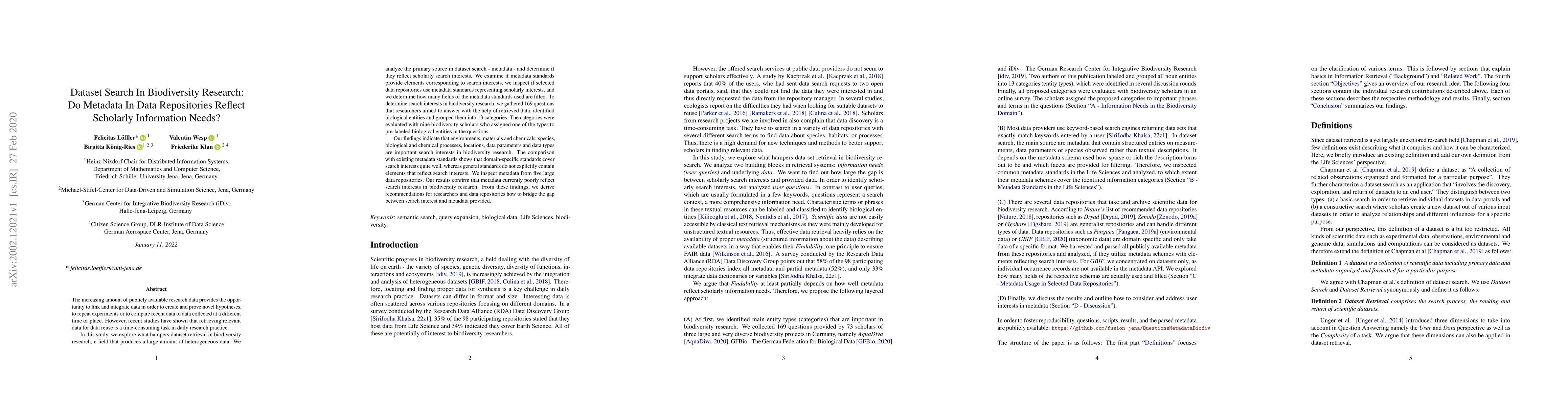 This study investigates the effectiveness of metadata in data repositories for biodiversity research, finding that current metadata often fails to reflect researchers' search interests. It concludes that domain-specific standards better align with search needs than general standards, and recommends improvements for both researchers and data repositories to enhance dataset retrieval.