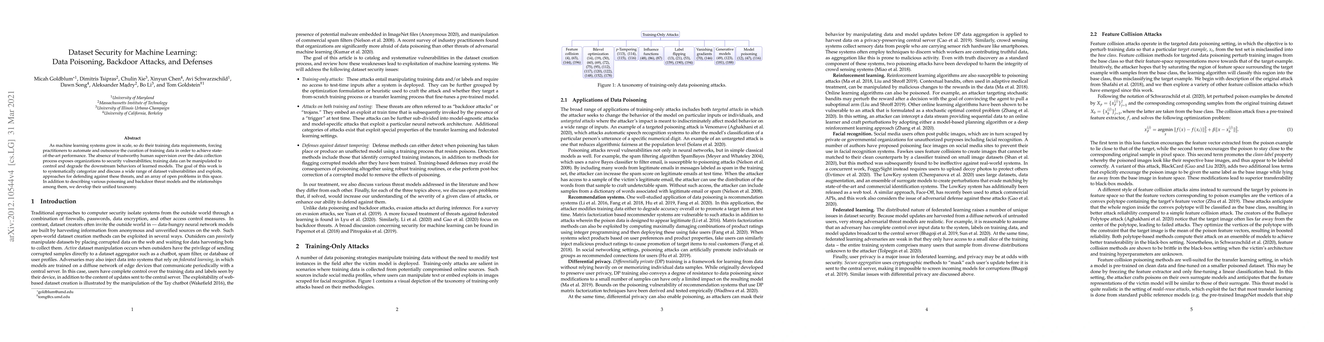 As machine learning systems grow in scale, so do their training data requirements, forcing practitioners to automate and outsource the curation of training data in order to achieve state-of-the-art performance. The absence of trustworthy human supervision over the data collection process exposes organizations to security vulnerabilities; training data can be manipulated to control and degrade the downstream behaviors of learned models. The goal of this work is to systematically categorize and discuss a wide range of dataset vulnerabilities and exploits, approaches for defending against these threats, and an array of open problems in this space. In addition to describing various poisoning and backdoor threat models and the relationships among them, we develop their unified taxonomy.