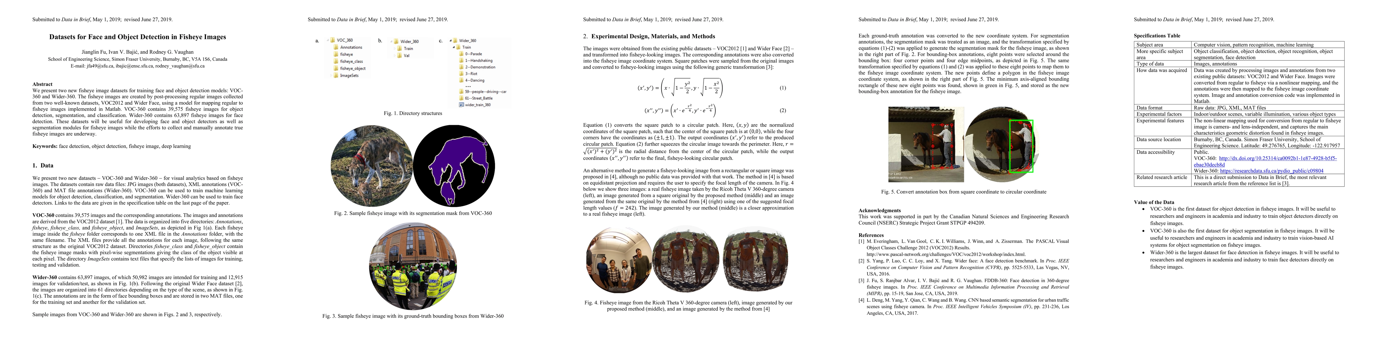 This paper introduces two new fisheye image datasets, VOC-360 and Wider-360, for training face and object detection models. These datasets are created by post-processing images from VOC2012 and Wider Face, and will aid in developing detectors and segmentation modules for fisheye images.
