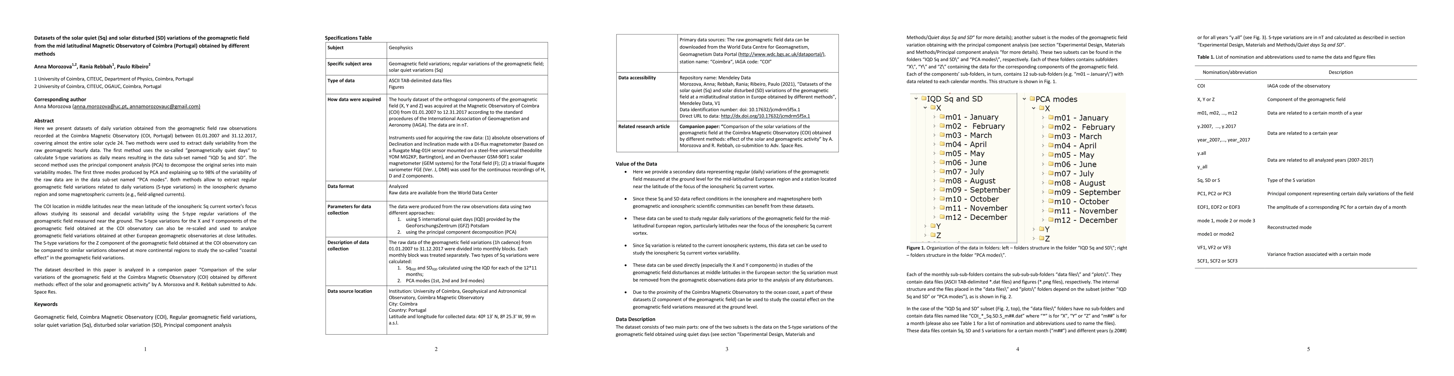 Here we present datasets of daily variation obtained from the geomagnetic field raw observations recorded at the Coimbra Magnetic Observatory (COI, Portugal) in 2007-2017, covering almost the entire solar cycle 24. Two methods were used to extract daily variability from the raw geomagnetic hourly data. The first method uses the so-called geomagnetically quiet days to calculate S-type variations as daily means resulting in the data sub-set named IQD Sq and SD. The second method uses the principal component analysis (PCA) to decompose the original series into main variability modes. The first three modes produced by PCA and explaining up to 98 per cent of the variability of the raw data are in the data sub-set named PCA modes. Both methods allow to extract regular geomagnetic field variations related to daily variations (S-type variations) in the ionospheric dynamo region and some magnetospheric currents. The COI location near the mean latitude of the ionospheric Sq current vortex focus allows studying its variability using the S-type regular variations of the geomagnetic field measured near the ground. The S-type variations for the X and Y components of the geomagnetic field obtained at the COI observatory can also be re-scaled and used to analyze field variations obtained at other European geomagnetic observatories at close latitudes. The S-type variations for the Z component of the geomagnetic field obtained at the COI observatory can be compared to similar variations observed at more continental regions to study the so-called coastal effect in the geomagnetic field variations. The dataset described in this paper is analyzed in a companion paper Comparison of the solar variations of the geomagnetic field at the Coimbra Magnetic Observatory (COI) obtained by different methods: effect of the solar and geomagnetic activity by A. Morozova and R. Rebbah submitted to ASR.