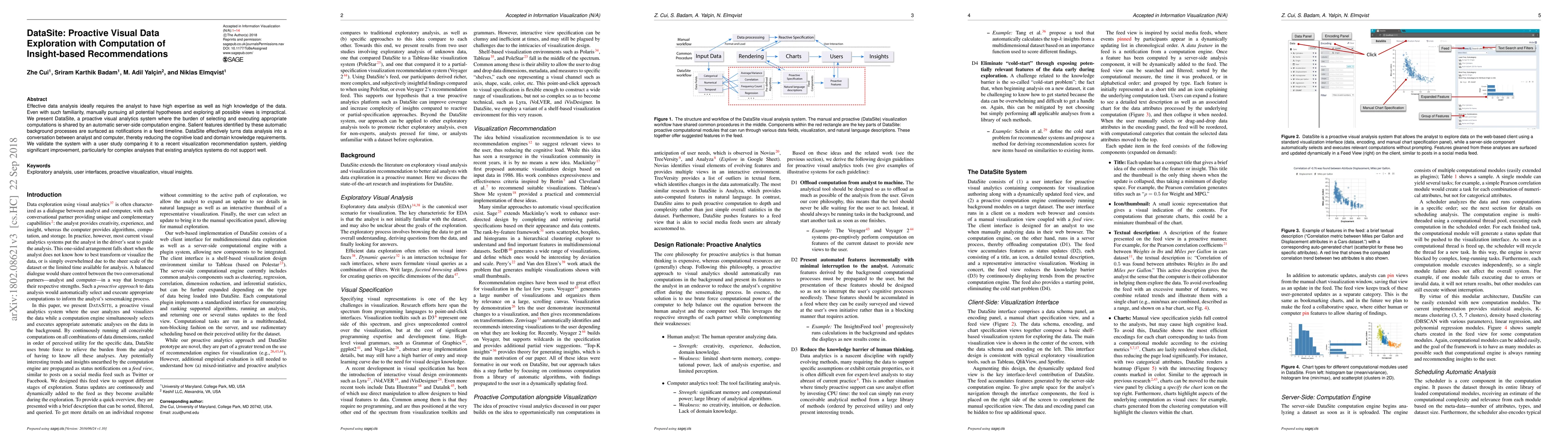 DataSite is a proactive visual analytics system that reduces cognitive load and domain knowledge requirements through automatic computation and salient feature notifications. It outperforms existing systems in complex analyses, improving user experience.