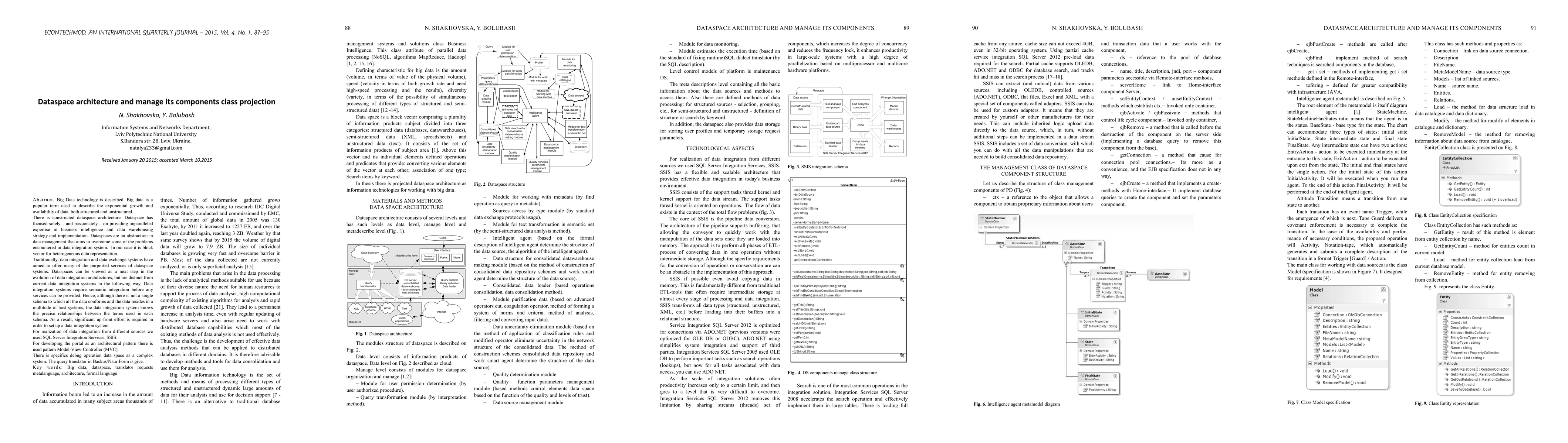 Big Data technology is described. Big data is a popular term used to describe the exponential growth and availability of data, both structured and unstructured. There is constructed dataspace architecture. Dataspace has focused solely - and passionately - on providing unparalleled expertise in business intelligence and data warehousing strategy and implementation. Dataspaces are an abstraction in data management that aims to overcome some of the problems encountered in data integration system. In our case it is block vector for heterogeneous data representation. Traditionally, data integration and data exchange systems have aimed to offer many of the purported services of dataspace systems. Dataspaces can be viewed as a next step in the evolution of data integration architectures, but are distinct from current data integration systems in the following way. Data integration systems require semantic integration before any services can be provided. Hence, although there is not a single schema to which all the data conforms and the data resides in a multitude of host systems, the data integration system knows the precise relationships between the terms used in each schema. As a result, significant up-front effort is required in order to set up a data integration system. For realization of data integration from different sources we used SQL Server Integration Services, SSIS. For developing the portal as an architectural pattern there is used pattern Model-View-Controller (MVC). There is specifics debug operation data space as a complex system. The query translator in Backus/Naur Form is give.