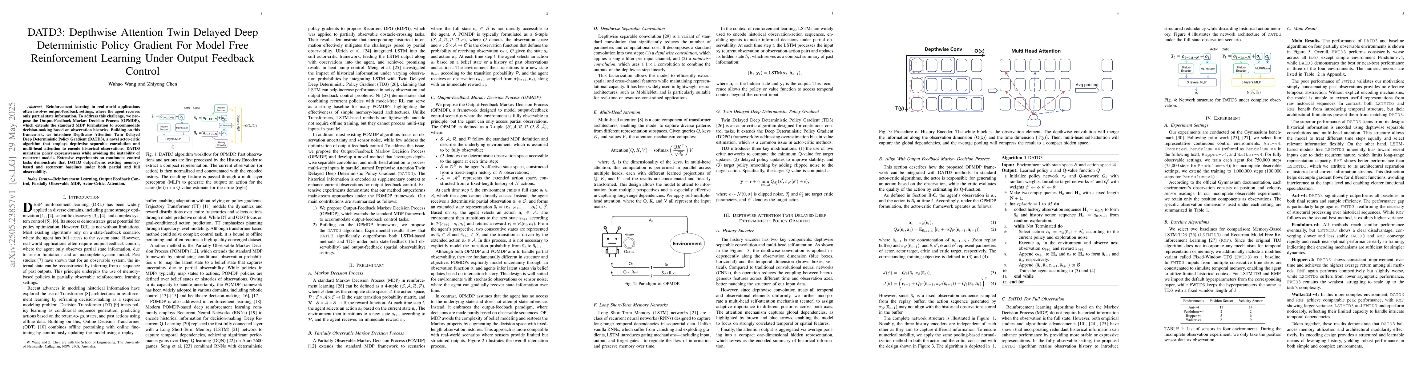 Reinforcement learning in real-world applications often involves output-feedback settings, where the agent receives only partial state information. To address this challenge, we propose the Output-Feedback Markov Decision Process (OPMDP), which extends the standard MDP formulation to accommodate decision-making based on observation histories. Building on this framework, we introduce Depthwise Attention Twin Delayed Deep Deterministic Policy Gradient (DATD3), a novel actor-critic algorithm that employs depthwise separable convolution and multi-head attention to encode historical observations. DATD3 maintains policy expressiveness while avoiding the instability of recurrent models. Extensive experiments on continuous control tasks demonstrate that DATD3 outperforms existing memory-based and recurrent baselines under both partial and full observability.