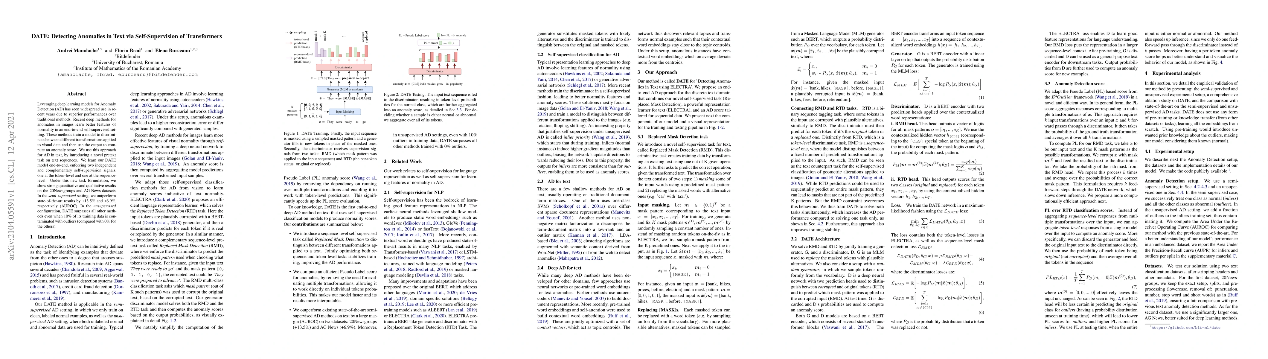 Leveraging deep learning models for Anomaly Detection (AD) has seen widespread use in recent years due to superior performances over traditional methods. Recent deep methods for anomalies in images learn better features of normality in an end-to-end self-supervised setting. These methods train a model to discriminate between different transformations applied to visual data and then use the output to compute an anomaly score. We use this approach for AD in text, by introducing a novel pretext task on text sequences. We learn our DATE model end-to-end, enforcing two independent and complementary self-supervision signals, one at the token-level and one at the sequence-level. Under this new task formulation, we show strong quantitative and qualitative results on the 20Newsgroups and AG News datasets. In the semi-supervised setting, we outperform state-of-the-art results by +13.5% and +6.9%, respectively (AUROC). In the unsupervised configuration, DATE surpasses all other methods even when 10% of its training data is contaminated with outliers (compared with 0% for the others).