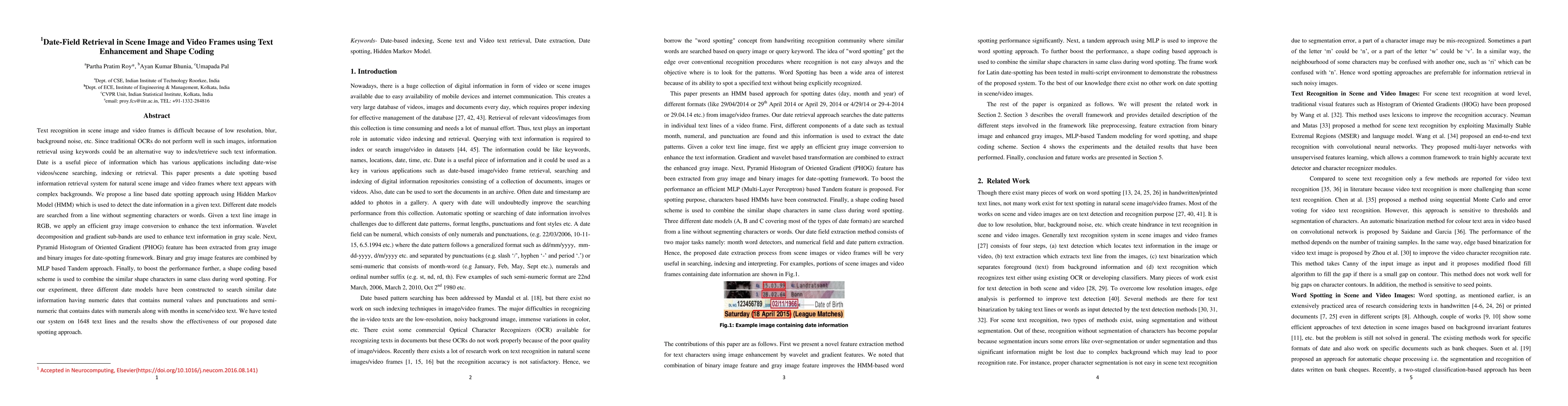 This paper proposes a date-spotting system for retrieving information from text in natural scene images and video frames using a line-based approach with Hidden Markov Model (HMM). The method enhances text information using wavelet decomposition and PHOG features, combining binary and gray image features for improved detection, and employs shape coding to group similar characters for better word spotting. Experiments on 1648 text lines demonstrate the effectiveness of the proposed method.