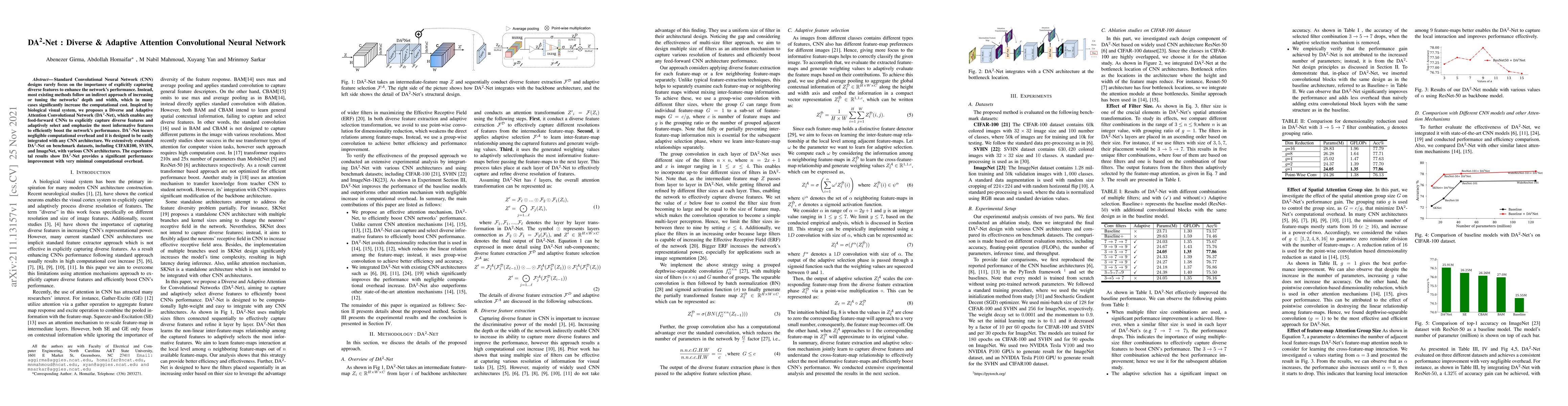 The DA$^{\textbf{2}}$-Net proposes a Diverse and Adaptive Attention Convolutional Network to explicitly capture diverse features and adaptively emphasize the most informative ones, significantly enhancing CNN performance with minimal computational cost. Extensive evaluations on CIFAR100, SVHN, and ImageNet show substantial performance improvements with negligible overhead.