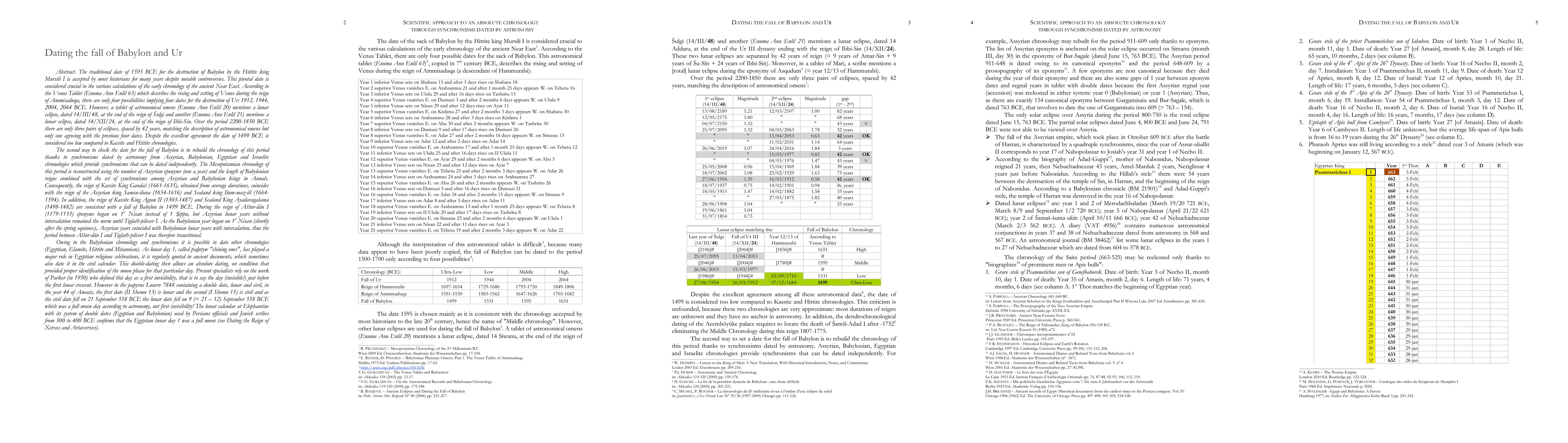 The traditional date of 1595 BCE for the destruction of Babylon by the Hittite king Mursili I is accepted by most historians for many years despite notable controversies. This pivotal date is considered crucial to the various calculations of the early chronology of the ancient Near East. According to the Venus Tablet (Enuma Anu Enlil 63) which describes the rising and setting of Venus during the reign of Ammisaduqa, there are only 4 possibilities implying 4 dates for the destruction of Ur (1912, 1944, 2004, 2064 BCE) but a tablet of astronomical omens (Enuma Anu Enlil 20,21) mentions a lunar eclipse, dated 14/III/48, at the end of the reign of Shulgi and a lunar eclipse, dated 14/XII/24, at the end of the reign of Ibbi-Sin. Over the period 2200-1850 BCE there are only 3 pairs of eclipses, spaced by 42 years, matching the description of astronomical omens but only 1 agreeing with the previous 4 dates. The second way to check the date for the fall of Babylon is to rebuild the chronology of this period thanks to synchronisms dated by astronomy from Assyrian, Babylonian, Egyptian and Israelite chronologies which provide synchronisms that can be dated independently. The Mesopotamian chronology of this period is reconstructed using the number of Assyrian eponyms (1 a year) and the length of Babylonian reigns combined with the set of synchronisms among Assyrian and Babylonian kings in Annals. During the reign of Assur-dan I (1179-1133) eponyms began on 1 Nisan instead of 1 Sippu, but Assyrian lunar years without intercalation remained the norm until Tiglath-pileser I. As the Babylonian year began on 1st Nisan (just after the spring equinox), Assyrian years coincided with Babylonian lunar years with intercalation, thus the period between Assur-dan I and Tiglath-pileser I was therefore transitional. Owing to the Babylonian chronology and synchronisms it is possible to date other chronologies.