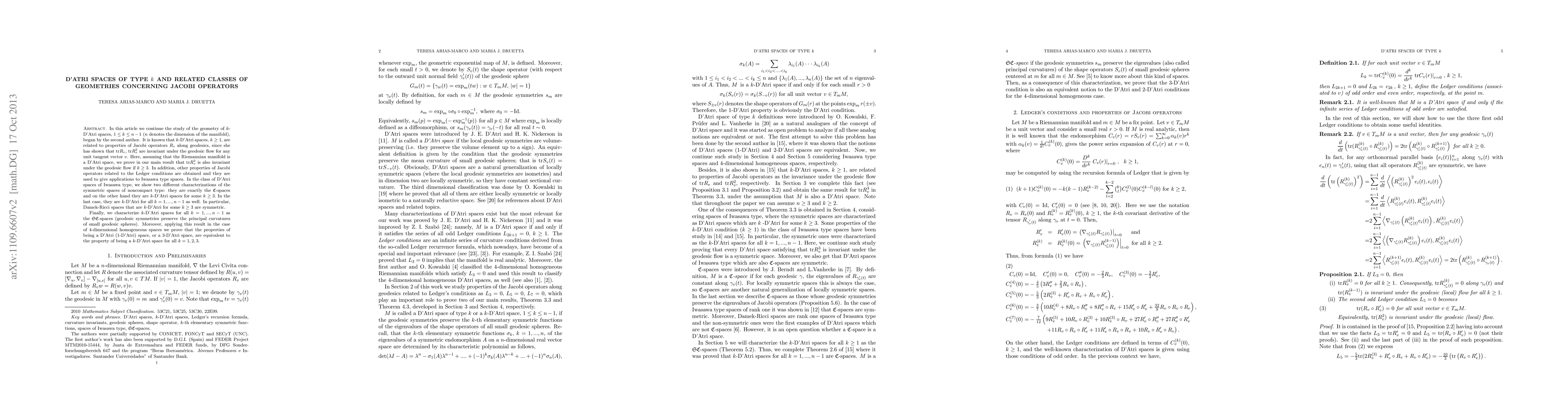 In this article we continue the study of the geometry of $k$-D'Atri spaces, $% 1\leq k$ $\leq n-1$ ($n$ denotes the dimension of the manifold)$,$ began by the second author. It is known that $k$-D'Atri spaces, $k\geq 1,$ are related to properties of Jacobi operators $R_{v}$ along geodesics, since she has shown that ${\operatorname{tr}}R_{v}$, ${\operatorname{tr}}R_{v}^{2}$ are invariant under the geodesic flow for any unit tangent vector $v$. Here, assuming that the Riemannian manifold is a D'Atri space, we prove in our main result that ${\operatorname{tr}}R_{v}^{3}$ is also invariant under the geodesic flow if $ k\geq 3$. In addition, other properties of Jacobi operators related to the Ledger conditions are obtained and they are used to give applications to Iwasawa type spaces. In the class of D'Atri spaces of Iwasawa type, we show two different characterizations of the symmetric spaces of noncompact type: they are exactly the $\frak{C}$-spaces and on the other hand they are $k$ -D'Atri spaces for some $k\geq 3.$ In the last case, they are $k$-D'Atri for all $k=1,...,n-1$ as well. In particular, Damek-Ricci spaces that are $k$-D'Atri for some $k\geq 3$ are symmetric. Finally, we characterize $k$-D'Atri spaces for all $k=1,...,n-1$ as the $% \frak{SC}$-spaces (geodesic symmetries preserve the principal curvatures of small geodesic spheres). Moreover, applying this result in the case of 4% -dimensional homogeneous spaces we prove that the properties of being a D'Atri (1-D'Atri) space, or a 3-D'Atri space, are equivalent to the property of being a $k$-D'Atri space for all $k=1,2,3$.