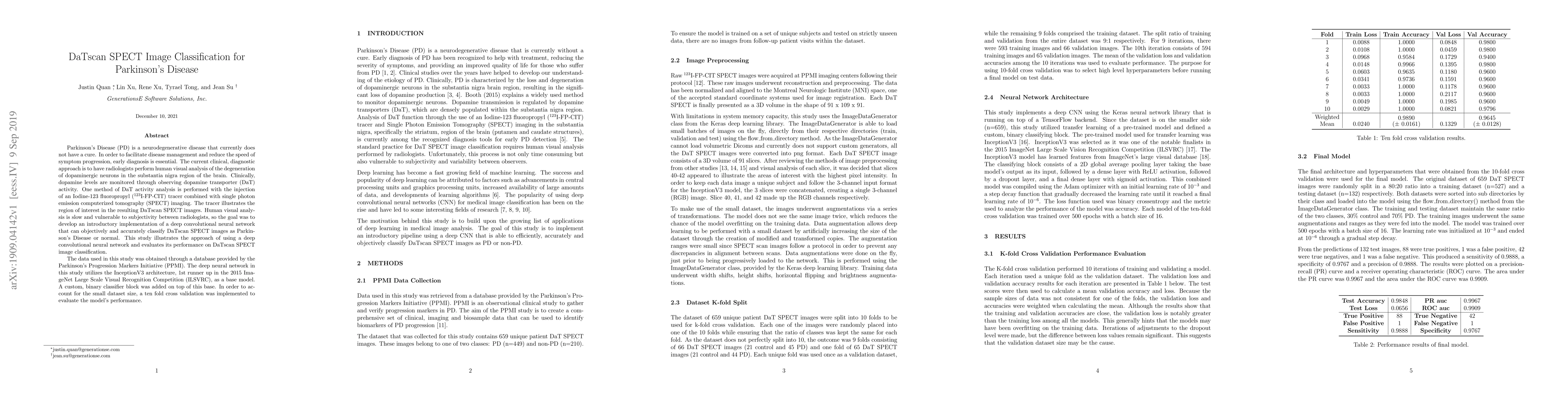 Parkinson's Disease (PD) is a neurodegenerative disease that currently does not have a cure. In order to facilitate disease management and reduce the speed of symptom progression, early diagnosis is essential. The current clinical, diagnostic approach is to have radiologists perform human visual analysis of the degeneration of dopaminergic neurons in the substantia nigra region of the brain. Clinically, dopamine levels are monitored through observing dopamine transporter (DaT) activity. One method of DaT activity analysis is performed with the injection of an Iodine-123 fluoropropyl (123I-FP-CIT) tracer combined with single photon emission computerized tomography (SPECT) imaging. The tracer illustrates the region of interest in the resulting DaTscan SPECT images. Human visual analysis is slow and vulnerable to subjectivity between radiologists, so the goal was to develop an introductory implementation of a deep convolutional neural network that can objectively and accurately classify DaTscan SPECT images as Parkinson's Disease or normal. This study illustrates the approach of using a deep convolutional neural network and evaluates its performance on DaTscan SPECT image classification. The data used in this study was obtained through a database provided by the Parkinson's Progression Markers Initiative (PPMI). The deep neural network in this study utilizes the InceptionV3 architecture, 1st runner up in the 2015 ImageNet Large Scale Visual Recognition Competition (ILSVRC), as a base model. A custom, binary classifier block was added on top of this base. In order to account for the small dataset size, a ten fold cross validation was implemented to evaluate the model's performance.