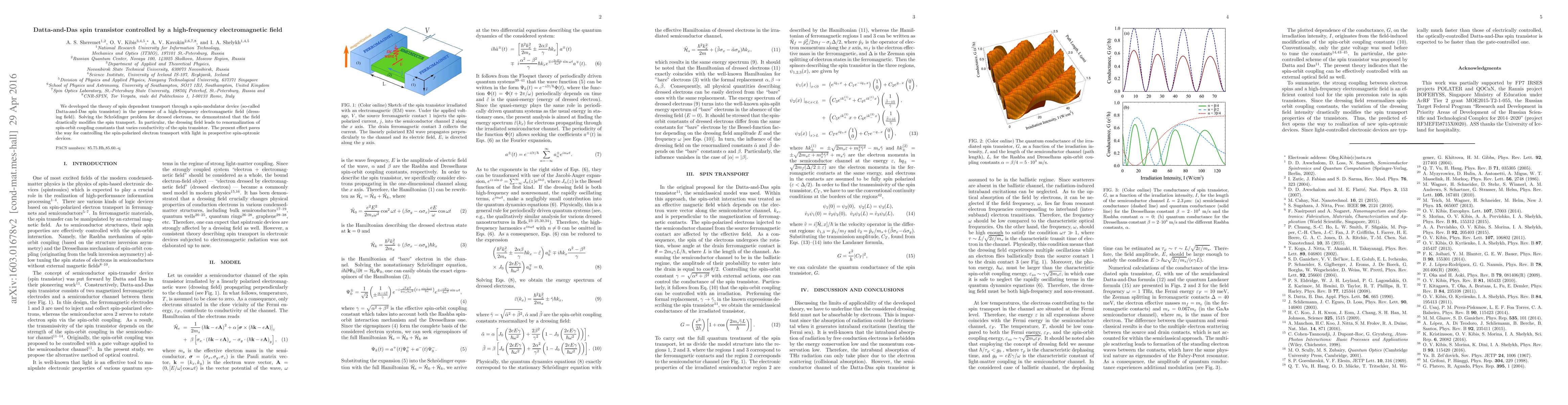 This paper develops a theoretical framework for spin-dependent transport in a Datta-and-Das spin transistor under a high-frequency electromagnetic field. The study shows that the field significantly modifies spin transport by renormalizing spin-orbit coupling constants, which in turn alters the transistor's conductivity and opens possibilities for controlling spin-polarized electron transport using light.