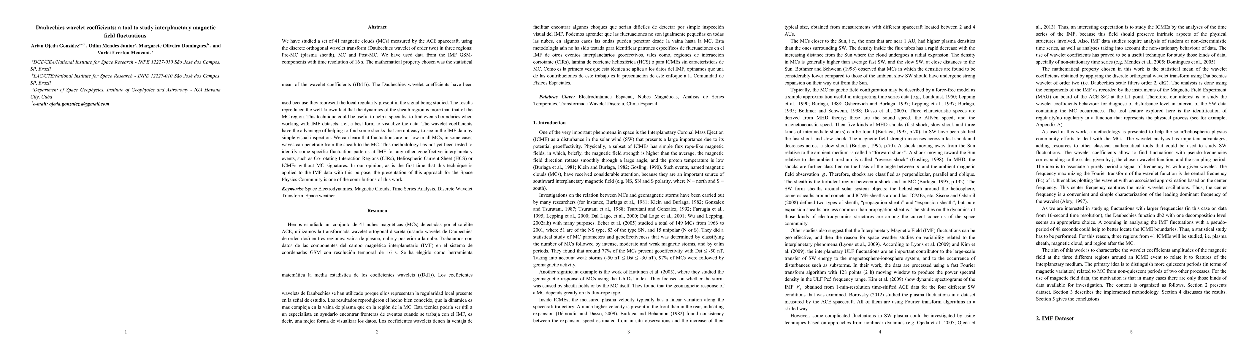We have studied a set of 41 magnetic clouds (MCs) measured by the ACE spacecraft, using the discrete orthogonal wavelet transform (Daubechies wavelet of order two) in three regions: Pre-MC (plasma sheath), MC and Post-MC. We have used data from the IMF GSM-components with time resolution of 16 s. The mathematical property chosen was the statistical mean of the wavelet coefficients $(\langle Dd1 \rangle)$. The Daubechies wavelet coefficients have been used because they represent the local regularity present in the signal being studied. The results reproduced the well-known fact that the dynamics of the sheath region is more than that of the MC region. This technique could be useful to help a specialist to find events boundaries when working with IMF datasets, i.e., a best form to visualize the data. The wavelet coefficients have the advantage of helping to find some shocks that are not easy to see in the IMF data by simple visual inspection. We can learn that fluctuations are not low in all MCs, in some cases waves can penetrate from the sheath to the MC. This methodology has not yet been tested to identify some specific fluctuation patterns at IMF for any other geoeffective interplanetary events, such as Co-rotating Interaction Regions (CIRs), Heliospheric Current Sheet (HCS) or ICMEs without MC signatures. In our opinion, as is the first time that this technique is applied to the IMF data with this purpose, the presentation of this approach for the Space Physics Community is one of the contributions of this work.