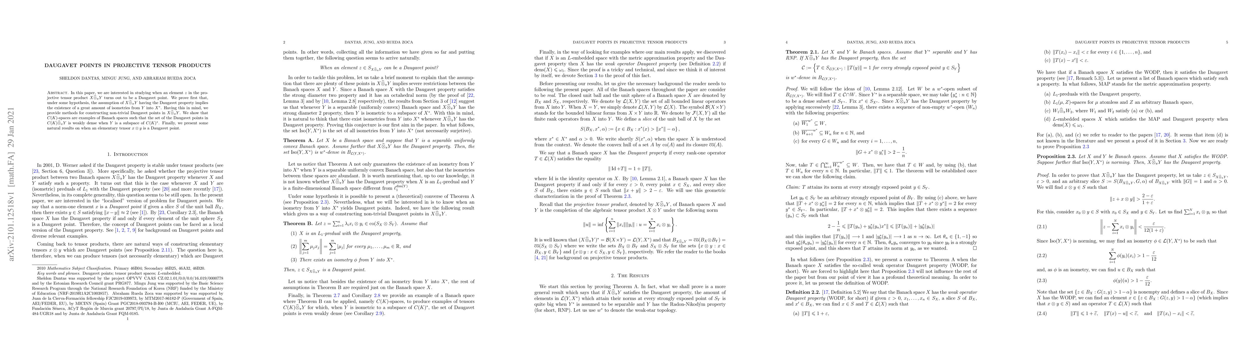 This paper investigates the conditions under which an element in the projective tensor product $X \widehat{\otimes}_\pi Y$ is a Daugavet point. It establishes that the Daugavet property in $X \widehat{\otimes}_\pi Y$ leads to many isometries from $Y$ to $X^*$, and provides methods for constructing such points. It also demonstrates that $C(K)$-spaces have weakly dense sets of Daugavet points when tensored with appropriate subspaces.