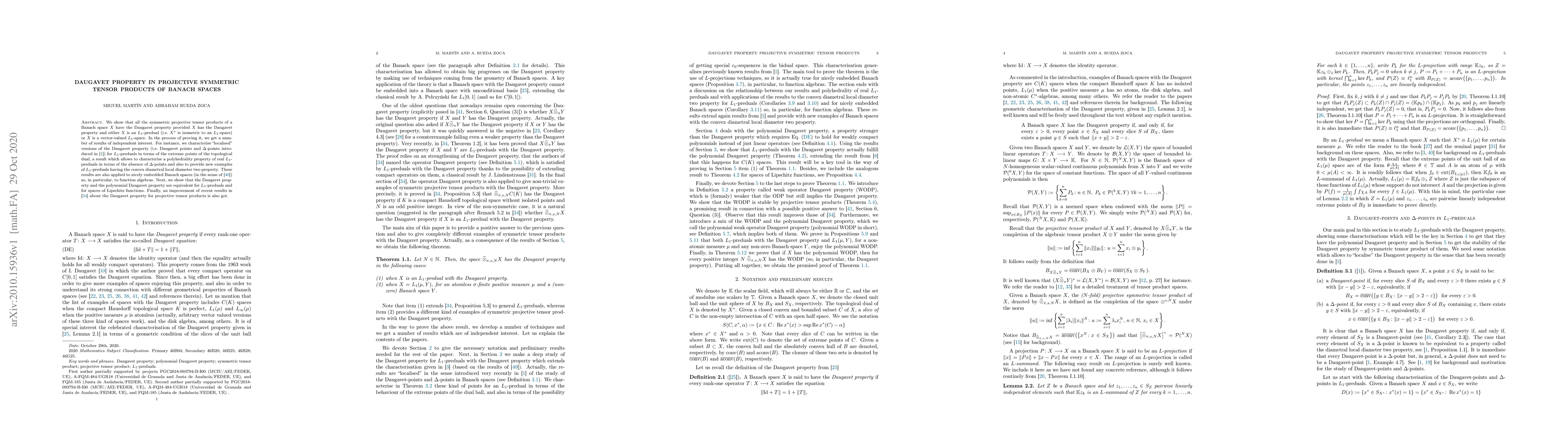 We show that all the symmetric projective tensor products of a Banach space $X$ have the Daugavet property provided $X$ has the Daugavet property and either $X$ is an $L_1$-predual (i.e.\ $X^*$ is isometric to an $L_1$-space) or $X$ is a vector-valued $L_1$-space. In the process of proving it, we get a number of results of independent interest. For instance, we characterise "localised" versions of the Daugavet property (i.e.\ Daugavet points and $\Delta$-points recently introduced) for $L_1$-preduals in terms of the extreme points of the topological dual, a result which allows to characterise a polyhedrality property of real $L_1$-preduals in terms of the absence of $\Delta$-points and also to provide new examples of $L_1$-preduals having the convex diametral local diameter two property. These results are also applied to nicely embedded Banach spaces so, in particular, to function algebras. Next, we show that the Daugavet property and the polynomial Daugavet property are equivalent for $L_1$-preduals and for spaces of Lipschitz functions. Finally, an improvement of recent results about the Daugavet property for projective tensor products is also got.
