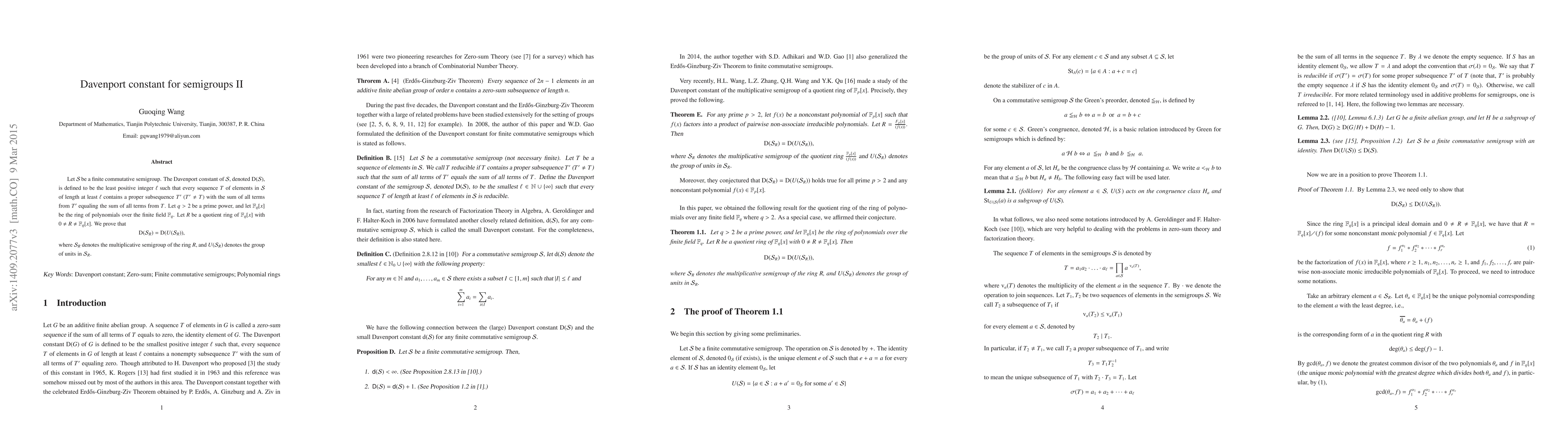 This paper investigates the Davenport constant for finite commutative semigroups, specifically proving that for a quotient ring $R$ of $\F_q[x]$, the Davenport constant of $R$ equals that of its group of units. This establishes a key equality in the study of additive bases within algebraic structures.