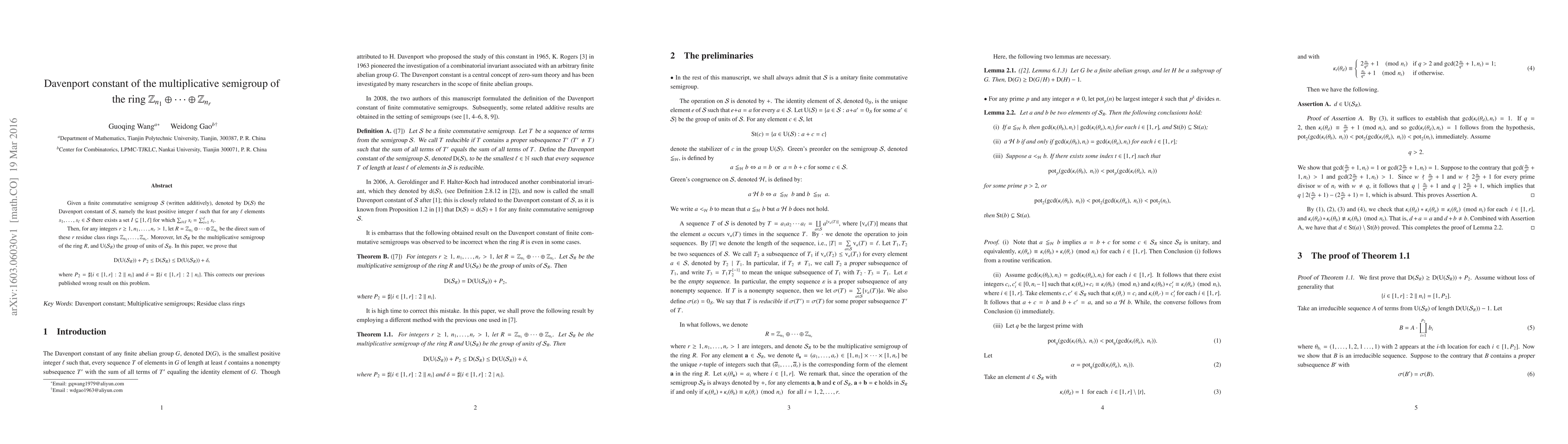This paper investigates the Davenport constant of the multiplicative semigroup $\mathcal{S}_R$ of the ring $\mathbb{Z}_{n_1}\oplus\cdots\oplus \mathbb{Z}_{n_r}$. The authors provide a corrected formula for the Davenport constant, establishing bounds that relate it to the group of units ${\rm U}(\mathcal{S}_R)$ and correcting previous errors.