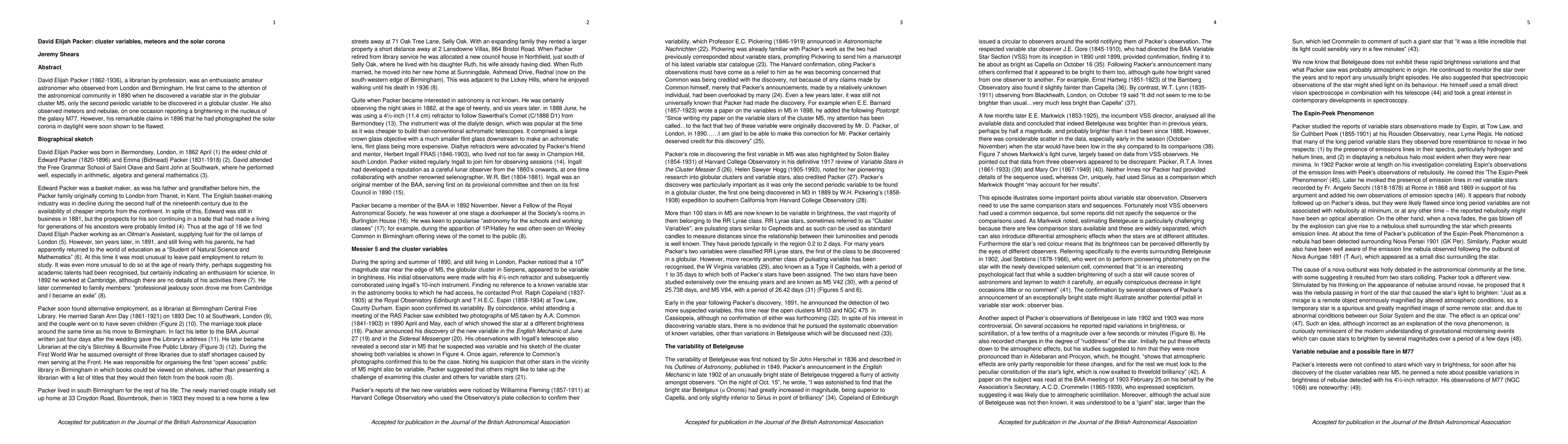 David Elijah Packer (1862-1936), a librarian by profession, was an enthusiastic amateur astronomer who observed from London and Birmingham. He first came to the attention of the astronomical community in 1890 when he discovered a variable star in the globular cluster M5, only the second periodic variable to be discovered in a globular cluster. He also observed meteors and nebulae, on one occasion reporting a brightening in the nucleus of the galaxy M77. However, his remarkable claims in 1896 that he had photographed the solar corona in daylight were soon shown to be flawed.