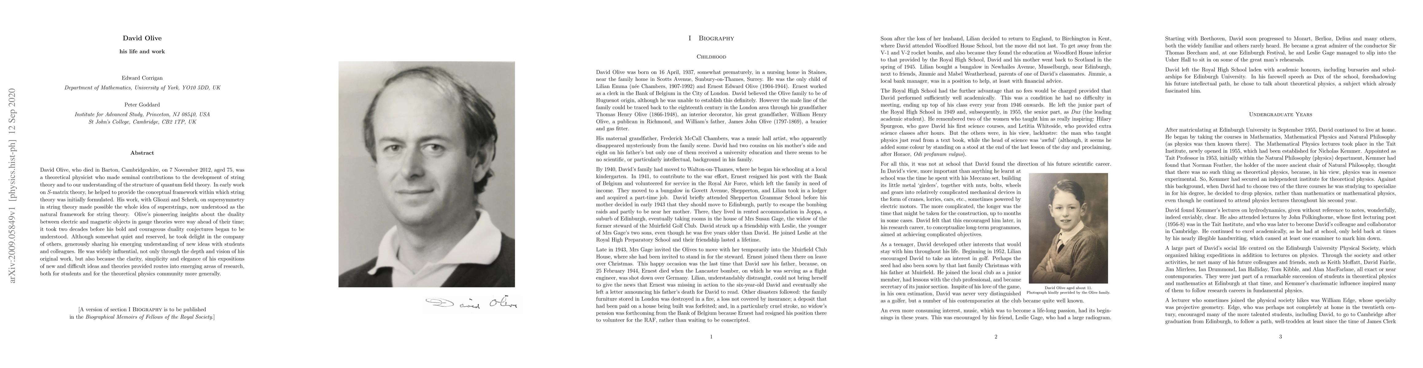 David Olive was a pioneering theoretical physicist whose contributions to string theory and quantum field theory, including foundational work on $S$-matrix theory and supersymmetry, significantly advanced the field. His foresight in duality conjectures and clear expositions greatly influenced both students and the broader theoretical physics community.