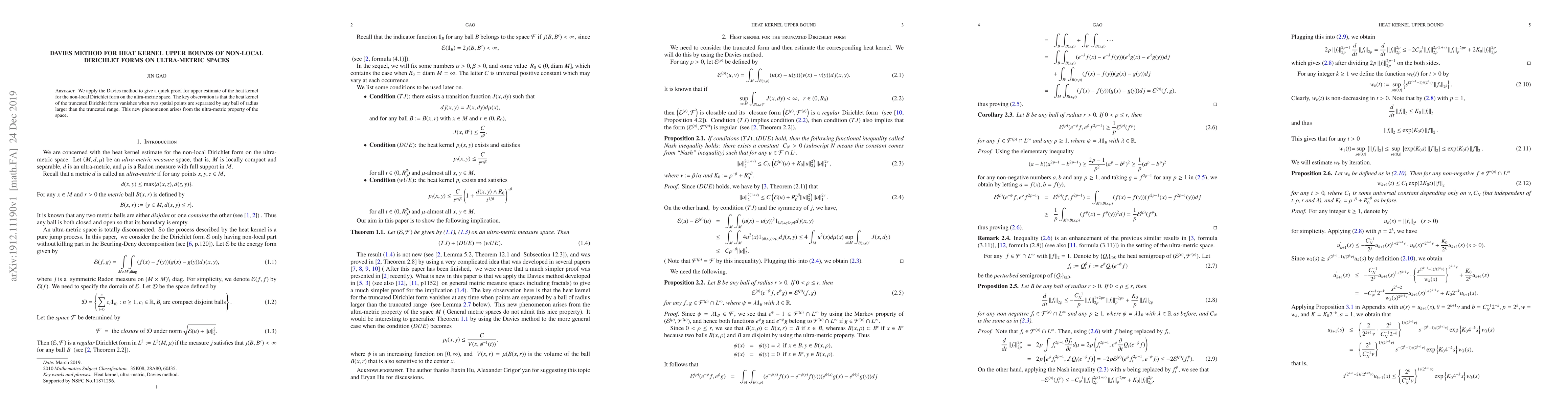 We apply the Davies method to give a quick proof for upper estimate of the heat kernel for the non-local Dirichlet form on the ultra-metric space. The key observation is that the heat kernel of the truncated Dirichlet form vanishes when two spatial points are separated by any ball of radius larger than the truncated range. This new phenomenon arises from the ultra-metric property of the space.