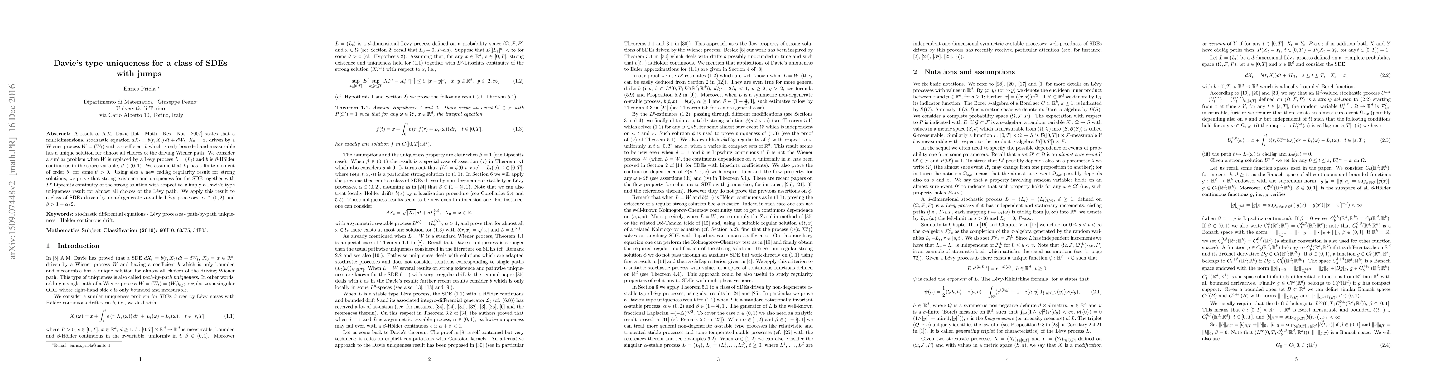 This paper extends Davie's type uniqueness result for SDEs driven by Wiener processes to those driven by Lévy processes, proving strong existence, uniqueness, and $L^p$-Lipschitz continuity under specific conditions on the Lévy process and the drift coefficient. The findings apply to SDEs driven by non-degenerate $\alpha$-stable Lévy processes.