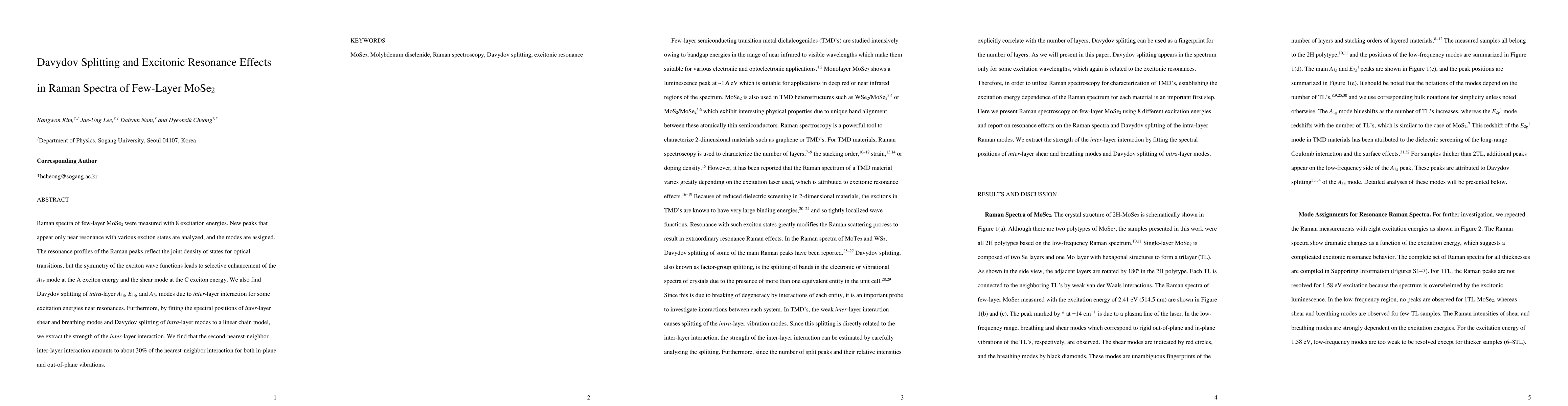 The paper investigates Raman spectra of few-layer MoSe2 with varying excitation energies, identifying new peaks near excitonic resonances and analyzing their assignment. The study reveals Davydov splitting of intra-layer modes due to inter-layer interactions and quantifies the strength of second-nearest-neighbor inter-layer interactions, finding it to be about 30% of the nearest-neighbor interaction.