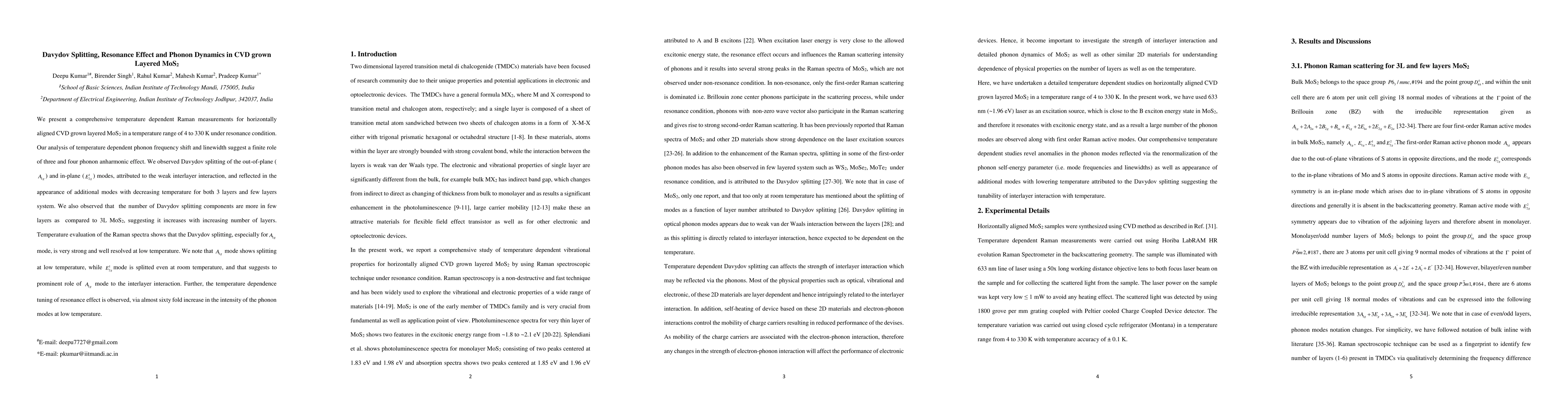 This study investigates the temperature-dependent Raman spectra of CVD grown layered MoS2, revealing significant Davydov splitting in both out-of-plane and in-plane phonon modes, indicative of weak interlayer interactions. The analysis suggests a strong resonance effect and anharmonic phonon interactions, with more pronounced splitting in few-layer systems compared to three-layer MoS2.