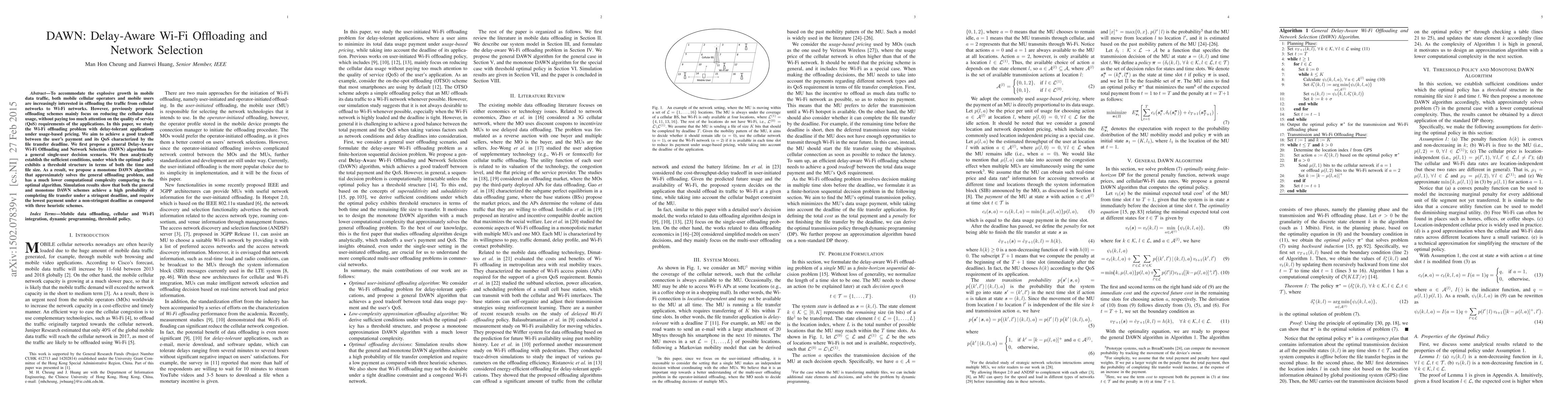 The DAWN algorithm optimizes Wi-Fi offloading for delay-tolerant applications, balancing user payment and QoS through a threshold-based approach, achieving high file transfer success rates and lower costs compared to heuristic methods. The proposed monotone DAWN variant offers a simpler, computationally efficient solution.