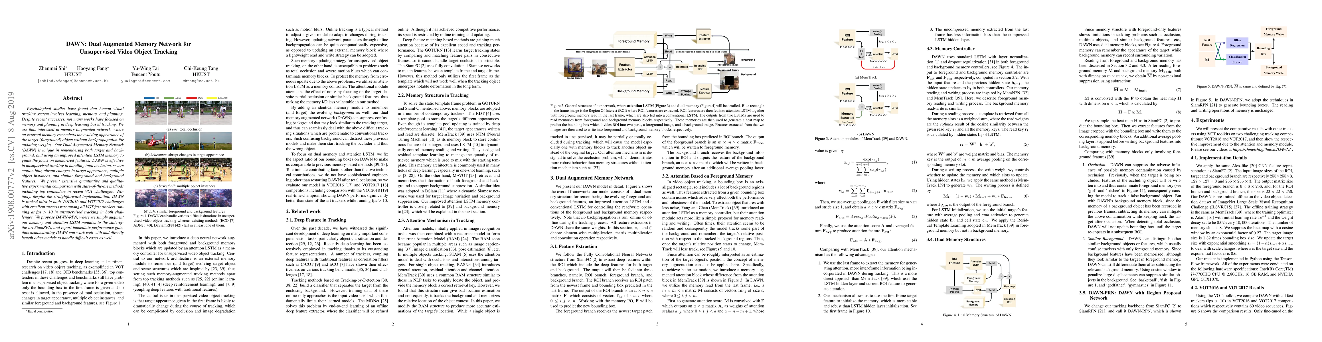 The DAWN network employs dual augmented memory to enhance unsupervised video object tracking by remembering both target and background features, guided by an improved attention LSTM. DAWN achieves high performance in challenging scenarios, ranking third in VOT2016 and VOT2017 challenges, and demonstrates significant improvement when integrated with the SiamRPN model.