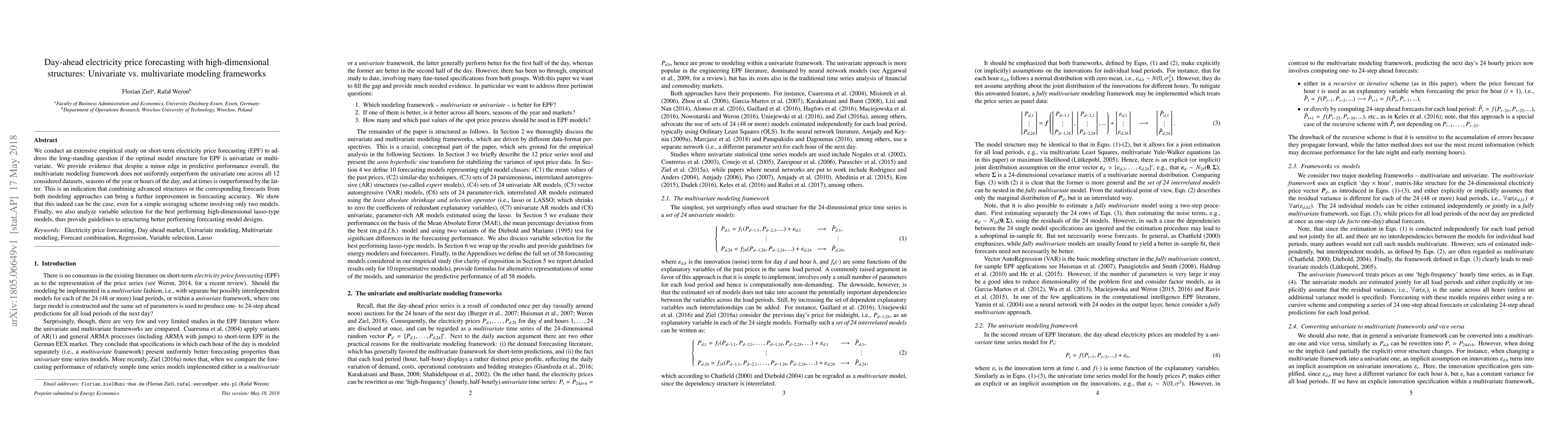 We conduct an extensive empirical study on short-term electricity price forecasting (EPF) to address the long-standing question if the optimal model structure for EPF is univariate or multivariate. We provide evidence that despite a minor edge in predictive performance overall, the multivariate modeling framework does not uniformly outperform the univariate one across all 12 considered datasets, seasons of the year or hours of the day, and at times is outperformed by the latter. This is an indication that combining advanced structures or the corresponding forecasts from both modeling approaches can bring a further improvement in forecasting accuracy. We show that this indeed can be the case, even for a simple averaging scheme involving only two models. Finally, we also analyze variable selection for the best performing high-dimensional lasso-type models, thus provide guidelines to structuring better performing forecasting model designs.
