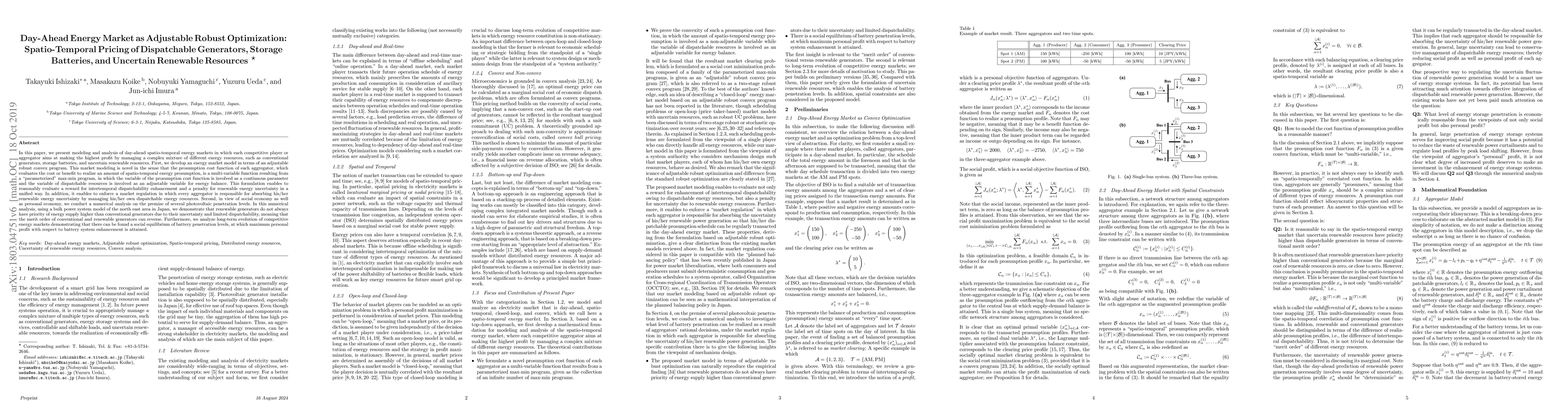 We present modeling and analysis of day-ahead spatio-temporal energy markets in which each competitive aggregator aims at making the highest profit by managing a complex mixture of different energy resources, such as conventional generators, storage batteries, and uncertain renewable resources. First, we develop an energy market model in terms of an adjustable robust convex program. This market modeling is novel in the sense that the prosumption cost function of each aggregator, which evaluates the cost to realize an amount of spatio-temporal energy prosumption, is a multi-variable function resulting from a "parameterized" max-min program, in which the variable of the prosumption cost function is involved as a continuous parameter and the variable of dispatchable resources is involved as an adjustable variable for energy balance. This formulation enables to reasonably evaluate a reward for intertemporal dispatchability enhancement and a penalty for renewable energy uncertainty in a unified way. In addition, it enables to enforce a market regulation in which every aggregator is responsible for absorbing his renewable energy uncertainty by managing his own dispatchable energy resources. Second, in view of social economy as well as personal economy, we conduct a numerical analysis on the premise of several photovoltaic penetration levels. In this numerical analysis, we demonstrate that renewable generators do not always have priority of energy supply higher than conventional generators due to their uncertainty and limited dispatchability, meaning that the merit order of conventional and renewable generators can reverse. Furthermore, we analyze long-term evolution of competitive energy markets demonstrating that there can be found a social equilibrium of battery penetration levels, at which maximum personal profit with respect to battery system enhancement is attained.