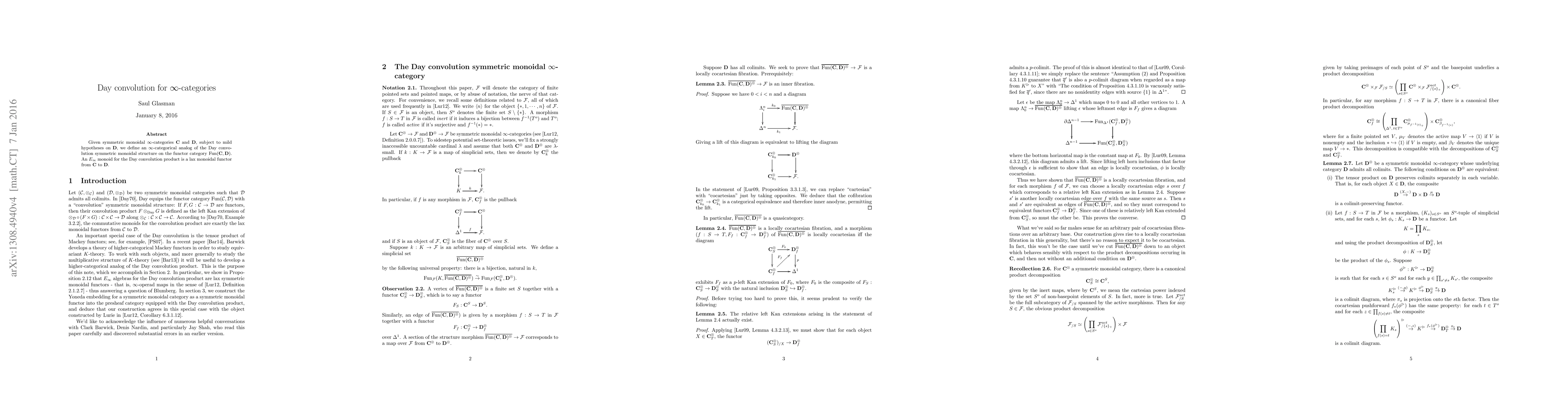 Two-line summary: This paper defines an infinity-categorical analog of Day convolution for symmetric monoidal infinity-categories, providing a symmetric monoidal structure on the functor category Fun(C, D). An E_infinity monoid for this structure is characterized as a lax monoidal functor from C to D.
