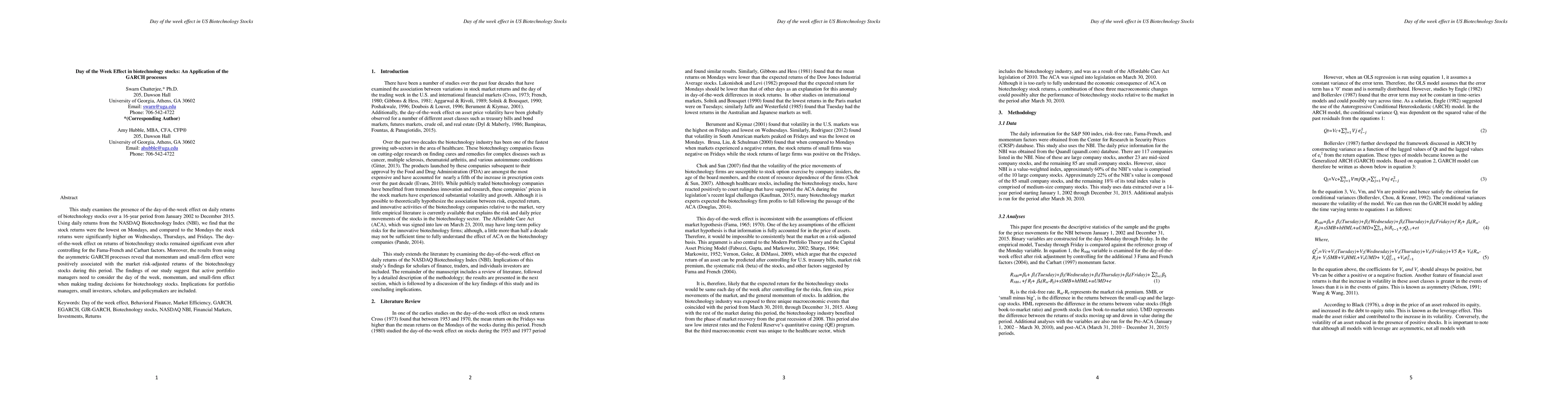 Biotechnology stocks show lowest returns on Mondays and highest on Wednesdays, Thursdays, and Fridays. Asymmetric GARCH processes reveal positive associations between momentum, small-firm effect and market risk-adjusted returns.