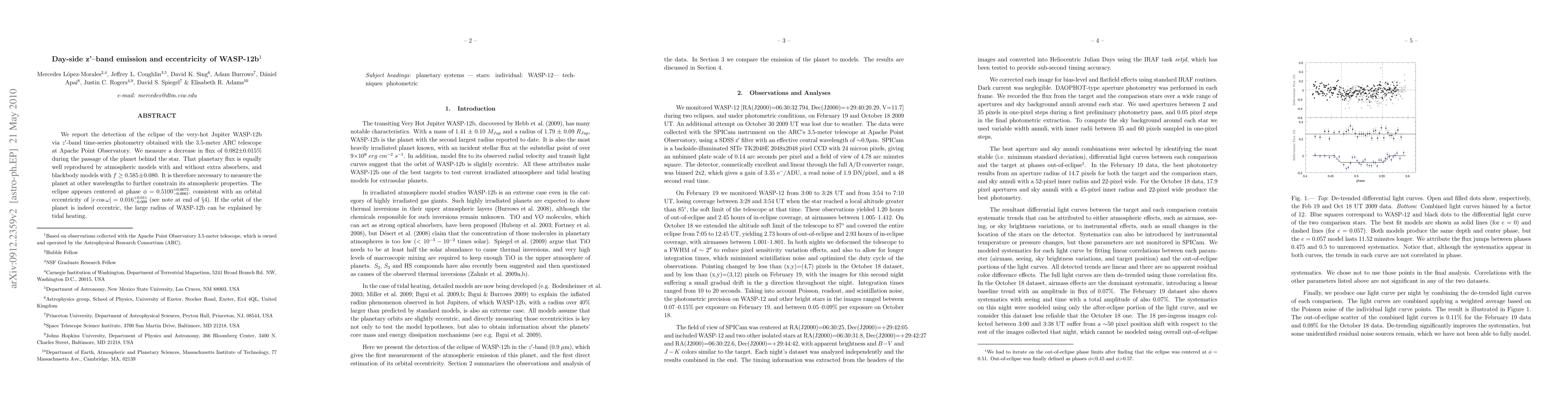 This study detected the eclipse of WASP-12b in the z'-band, revealing a 0.082% decrease in flux, suggesting atmospheric models with or without extra absorbers fit the data. The eclipse's timing indicates an orbital eccentricity of |e cos w| = 0.016, potentially explaining the planet's large radius through tidal heating.