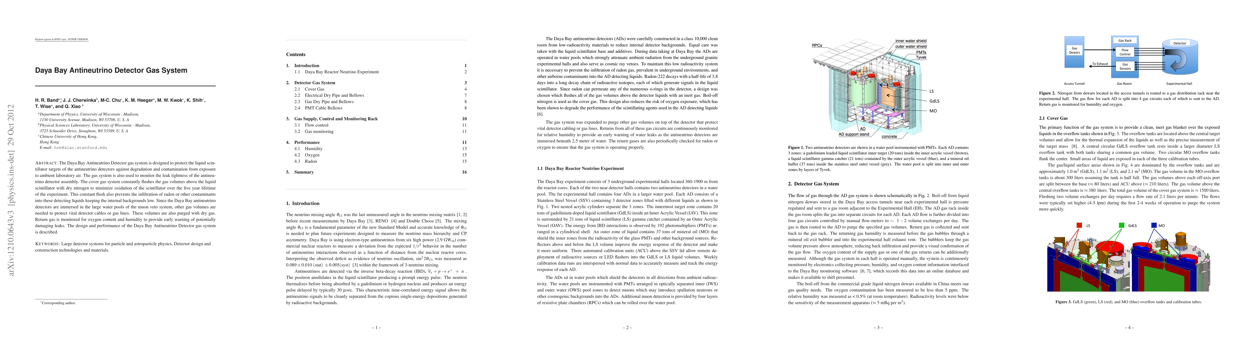 The Daya Bay Antineutrino Detector gas system employs dry nitrogen to protect liquid scintillator targets from oxidation and contamination, while also monitoring for leaks and maintaining low internal backgrounds. The system ensures the integrity of detector cables and gas lines through continuous purging and monitoring of return gas.
