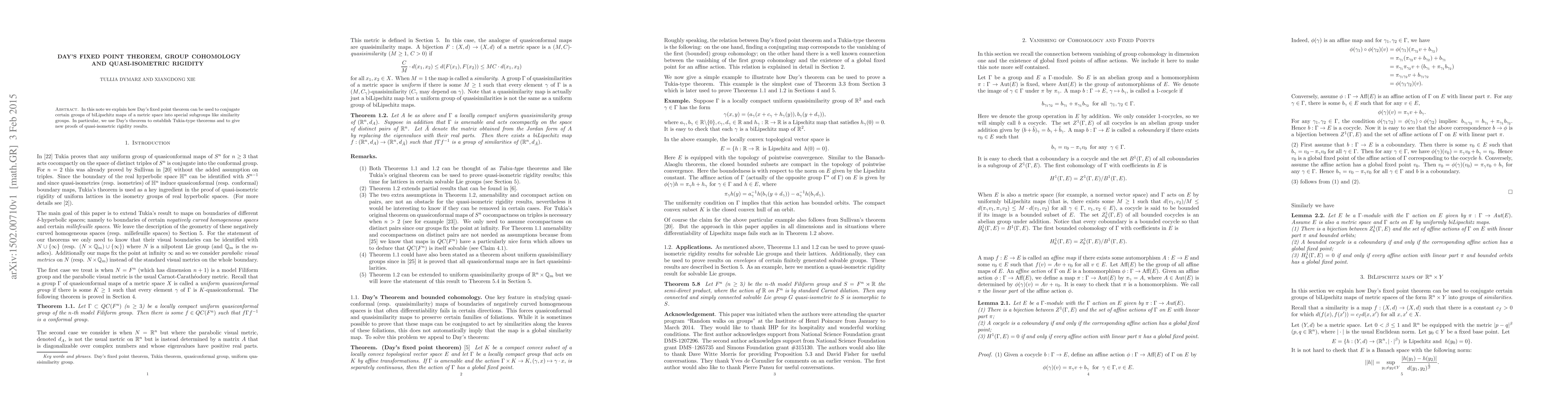 Summary: Day's fixed point theorem is applied to conjugate groups of biLipschitz maps into special subgroups, establishing Tukia-type theorems and providing new proofs for quasi-isometric rigidity results in group cohomology.