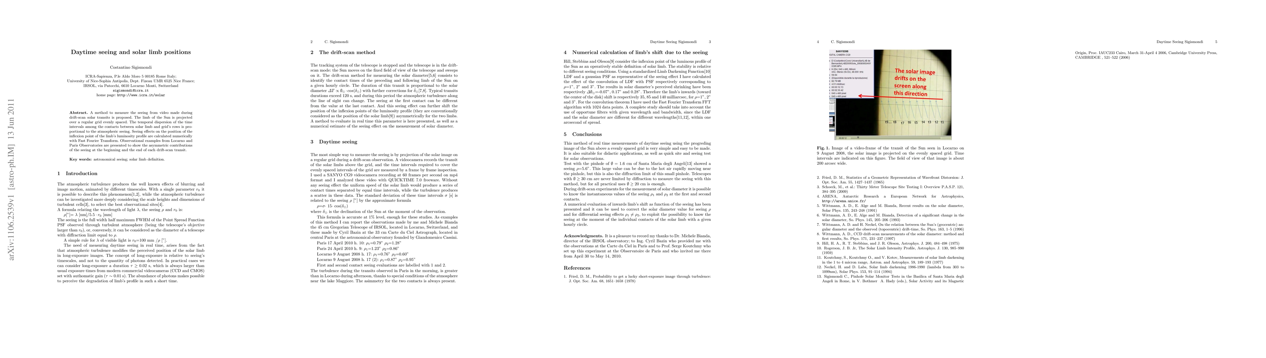 A method to measure the seeing from video made during drift-scan solar transits is proposed. The limb of the Sun is projected over a regular grid evenly spaced. The temporal dispersion of the time intervals among the contacts between solar limb and grid's rows is proportional to the atmospheric seeing. Seeing effects on the position of the inflexion point of the limb's luminosity profile are calculated numerically with Fast Fourier Transform. Observational examples from Locarno and Paris Observatories are presented to show the asymmetric contributions of the seeing at the beginning and the end of each drift-scan transit.