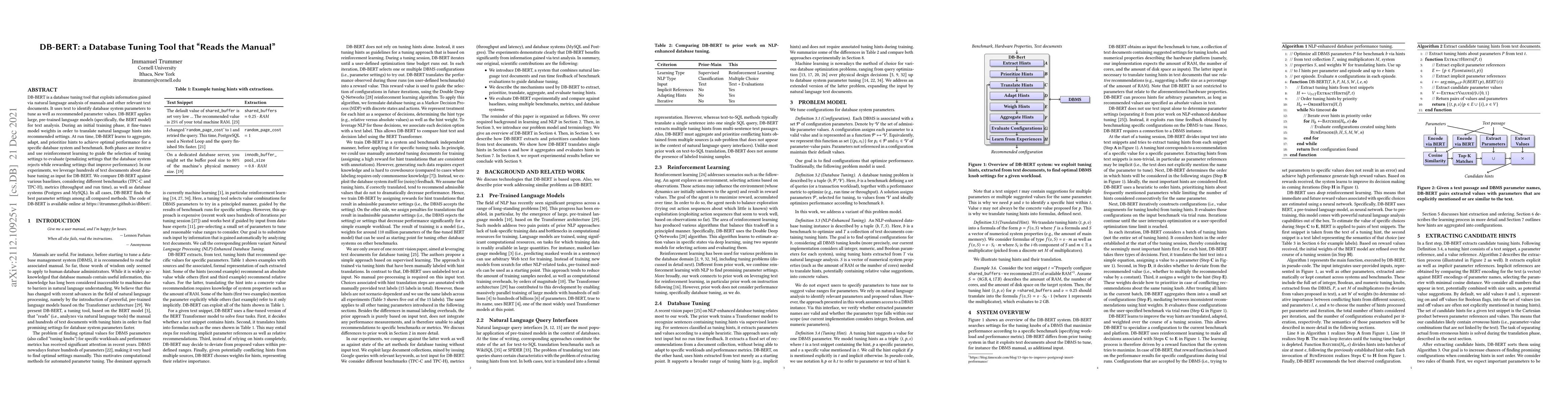 DB-BERT is a database tuning tool that leverages natural language processing to analyze manuals and text documents for optimal database parameter settings. It uses BERT for text analysis and reinforcement learning to iteratively fine-tune settings, outperforming various baselines in performance benchmarks.