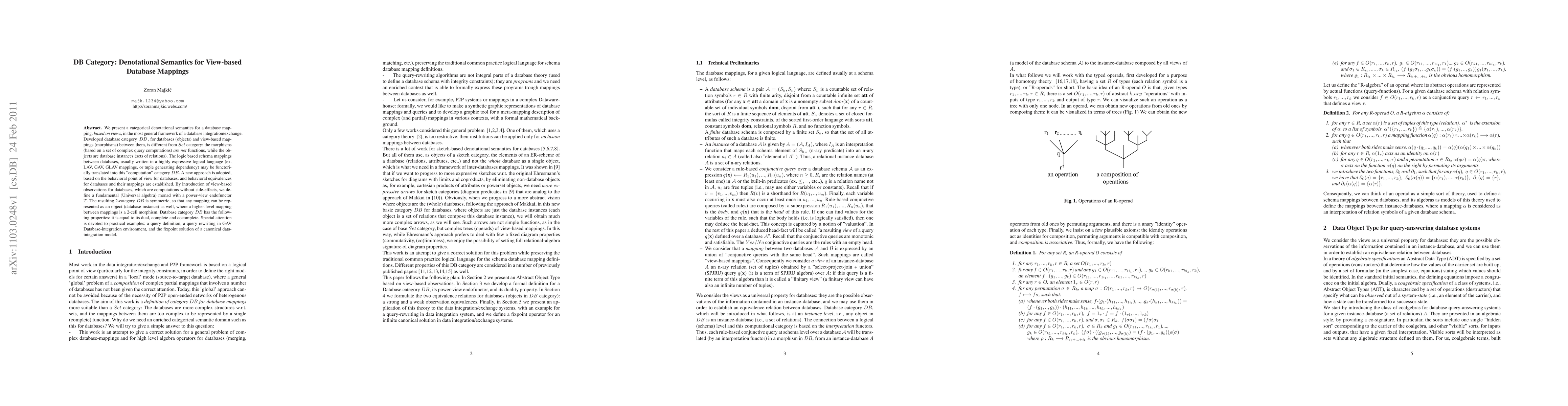We present a categorical denotational semantics for a database mapping, based on views, in the most general framework of a database integration/exchange. Developed database category DB, for databases (objects) and view-based mappings (morphisms) between them, is different from Set category: the morphisms (based on a set of complex query computations) are not functions, while the objects are database instances (sets of relations). The logic based schema mappings between databases, usually written in a highly expressive logical language (ex. LAV, GAV, GLAV mappings, or tuple generating dependency) may be functorially translated into this "computation" category DB. A new approach is adopted, based on the behavioral point of view for databases, and behavioral equivalences for databases and their mappings are established. By introduction of view-based observations for databases, which are computations without side-effects, we define a fundamental (Universal algebra) monad with a power-view endofunctor T. The resulting 2-category DB is symmetric, so that any mapping can be represented as an object (database instance) as well, where a higher-level mapping between mappings is a 2-cell morphism. Database category DB has the following properties: it is equal to its dual, complete and cocomplete. Special attention is devoted to practical examples: a query definition, a query rewriting in GAV Database-integration environment, and the fixpoint solution of a canonical data integration model.