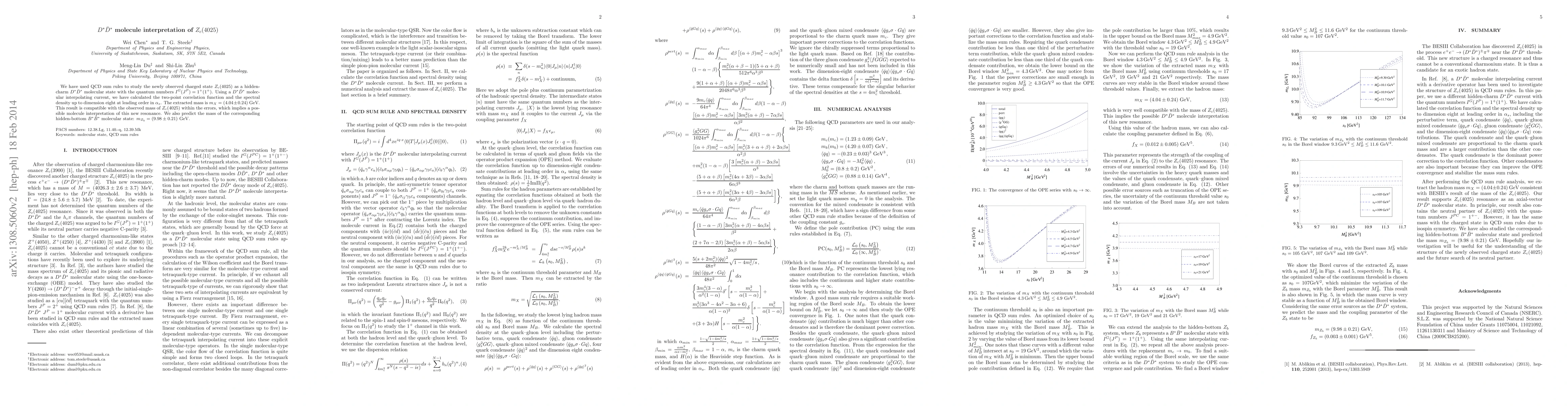 We have used QCD sum rules to study the newly observed charged state $Z_c(4025)$ as a hidden-charm $D^*\bar D^*$ molecular state with the quantum numbers $I^G(J^{P})=1^+(1^{+})$. Using a $D^*\bar D^*$ molecular interpolating current, we have calculated the two-point correlation function and the spectral density up to dimension eight at leading order in $\alpha_s$. The extracted mass is $m_X=(4.04\pm0.24)$ GeV. This result is compatible with the observed mass of $Z_c(4025)$ within the errors, which implies a possible molecule interpretation of this new resonance. We also predict the mass of the corresponding hidden-bottom $B^*\bar B^*$ molecular state: $m_{Z_b}=(9.98\pm0.21)$ GeV.