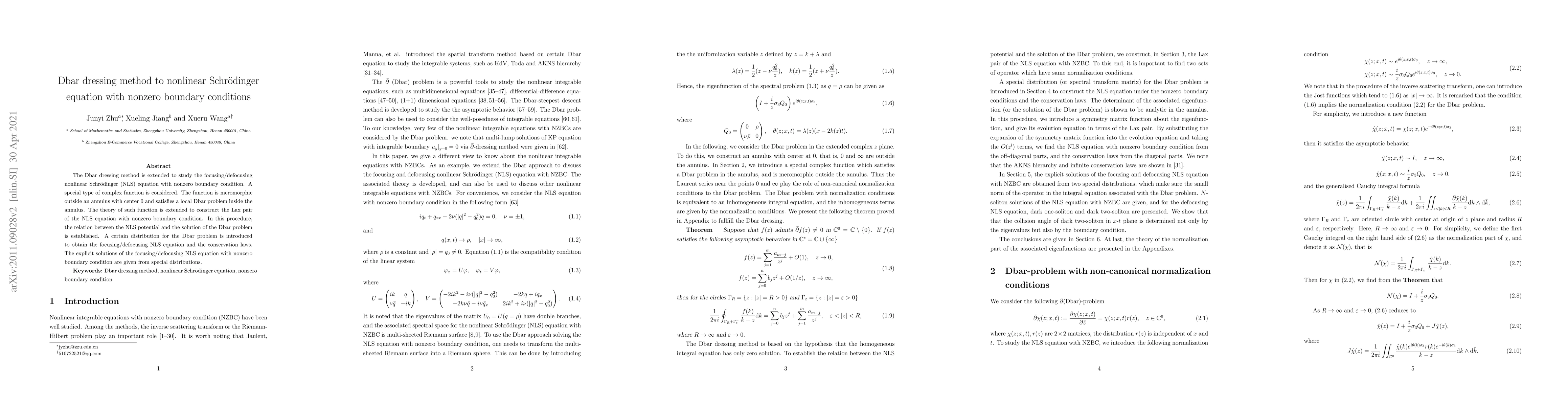 The Dbar dressing method is applied to solve the nonlinear Schrödinger equation with nonzero boundary conditions, constructing a Lax pair using a meromorphic function that satisfies a local Dbar problem. Explicit solutions are derived from special distributions, establishing conservation laws.