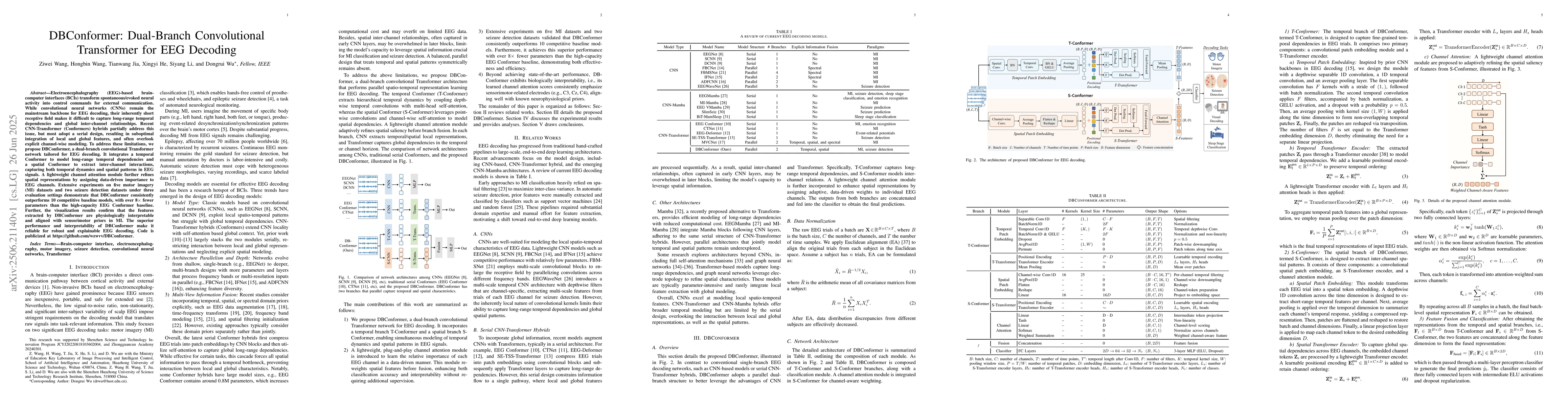 Electroencephalography (EEG)-based brain-computer interfaces (BCIs) transform spontaneous/evoked neural activity into control commands for external communication. While convolutional neural networks (CNNs) remain the mainstream backbone for EEG decoding, their inherently short receptive field makes it difficult to capture long-range temporal dependencies and global inter-channel relationships. Recent CNN-Transformer (Conformers) hybrids partially address this issue, but most adopt a serial design, resulting in suboptimal integration of local and global features, and often overlook explicit channel-wise modeling. To address these limitations, we propose DBConformer, a dual-branch convolutional Transformer network tailored for EEG decoding. It integrates a temporal Conformer to model long-range temporal dependencies and a spatial Conformer to extract inter-channel interactions, capturing both temporal dynamics and spatial patterns in EEG signals. A lightweight channel attention module further refines spatial representations by assigning data-driven importance to EEG channels. Extensive experiments on five motor imagery (MI) datasets and two seizure detection datasets under three evaluation settings demonstrate that DBConformer consistently outperforms 10 competitive baseline models, with over eight times fewer parameters than the high-capacity EEG Conformer baseline. Further, the visualization results confirm that the features extracted by DBConformer are physiologically interpretable and aligned with sensorimotor priors in MI. The superior performance and interpretability of DBConformer make it reliable for robust and explainable EEG decoding. Code is publicized at https://github.com/wzwvv/DBConformer.